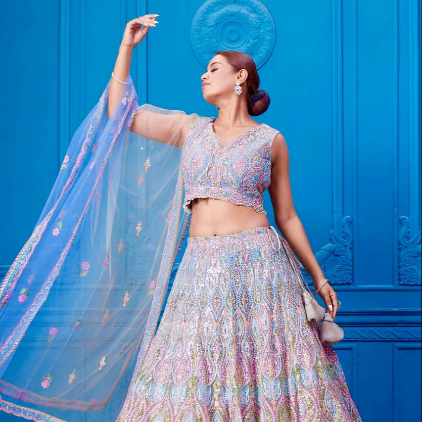 VISHNU K DESIGNS LAHENGA CHOLI DUPATTA, TELA DE MALLA SUAVE Y PESADA, BORDADO CON ESPEJOS REALES, ESTILO VINTAGE, SILUETA SUELA, NATURAL