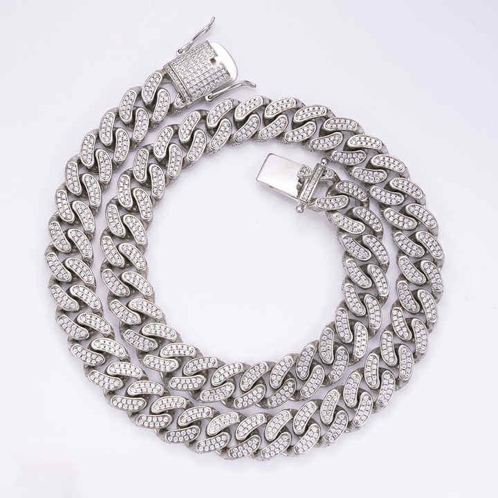 Collar de Cadena Cubana con Diamantes Cultivados en Laboratorio VS1, Doble Hilera, Chapado en Oro Blanco, Plata 925, Joyería Hip Hop Unisex, Cadena para Raperos