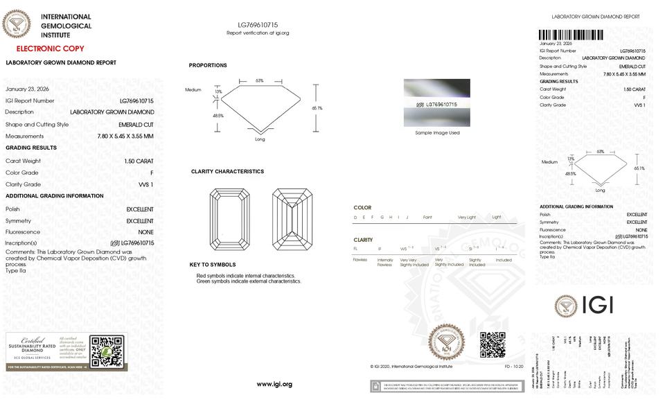 Diamante Cultivado en Laboratorio CVD, Corte Esmeralda, Claridad VVS1, Color F, 1.50 Quilates, con Certificado IGI, para un Centro de Anillo Impresionante
