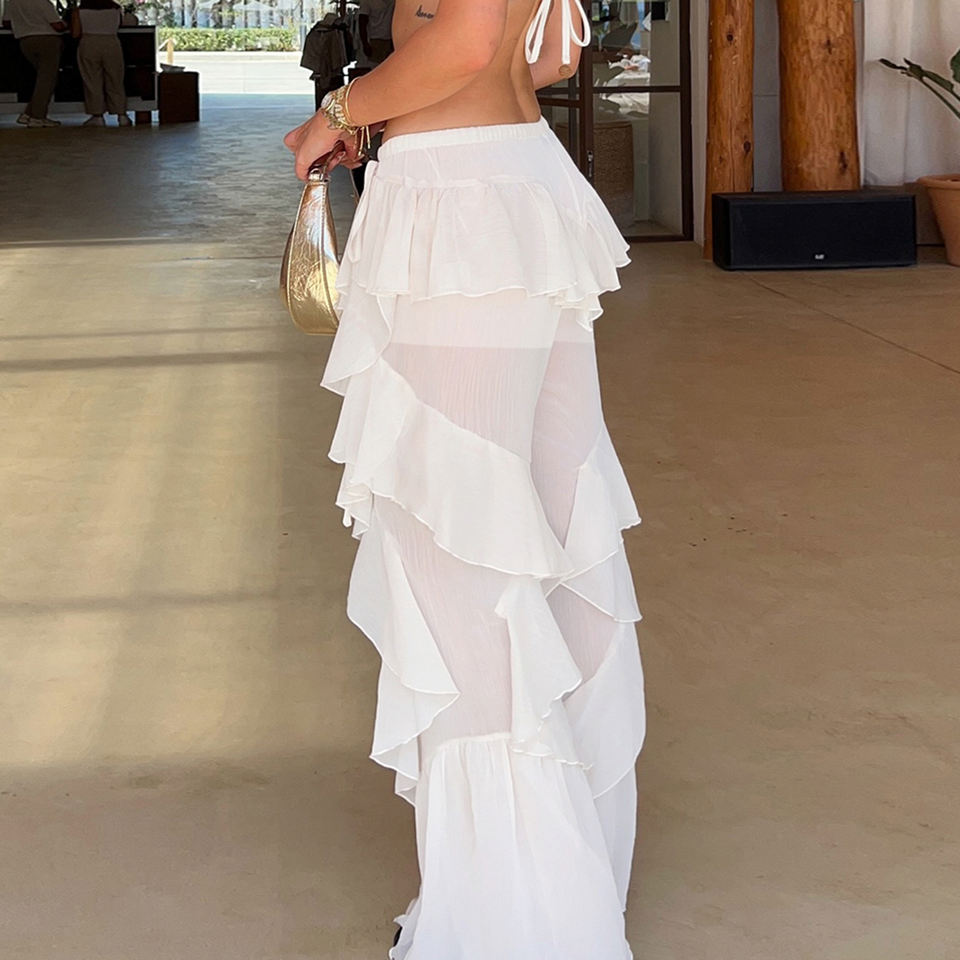 Pantalones Casuales Acampanados de Malla Transparente con Volantes Blancos Estilo Vacacional para Mujer, de Alta Calidad, con Cintura Atada, ¡Gran Venta!
