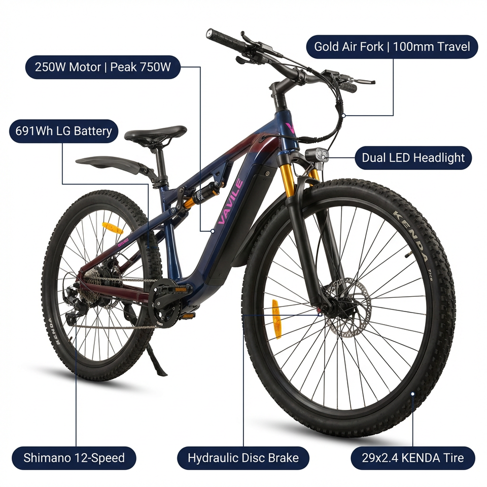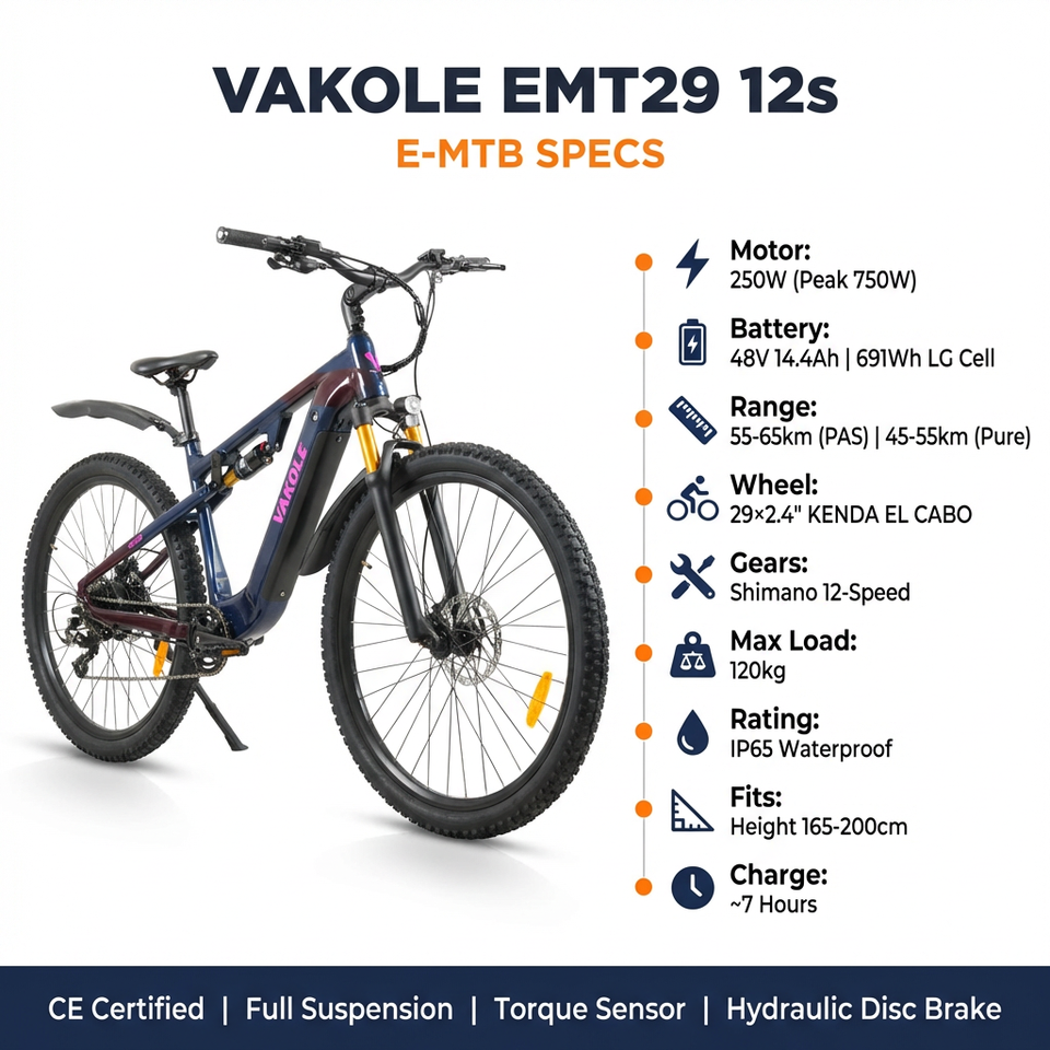 Bicicleta Eléctrica de Montaña Vakole EMT29 12S de 29 Pulgadas con Suspensión Completa, 250W, 691Wh, 48V, 14.4Ah, Sensor de Torque, Cross Country, EMTB, Almacén en la UE
