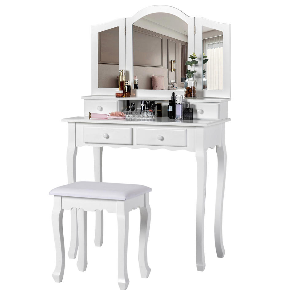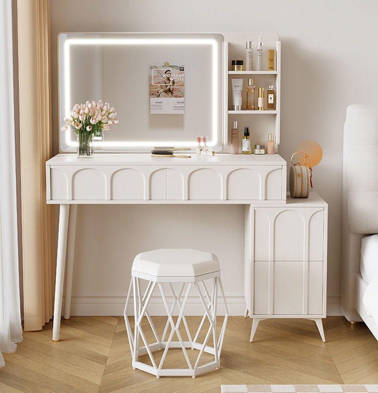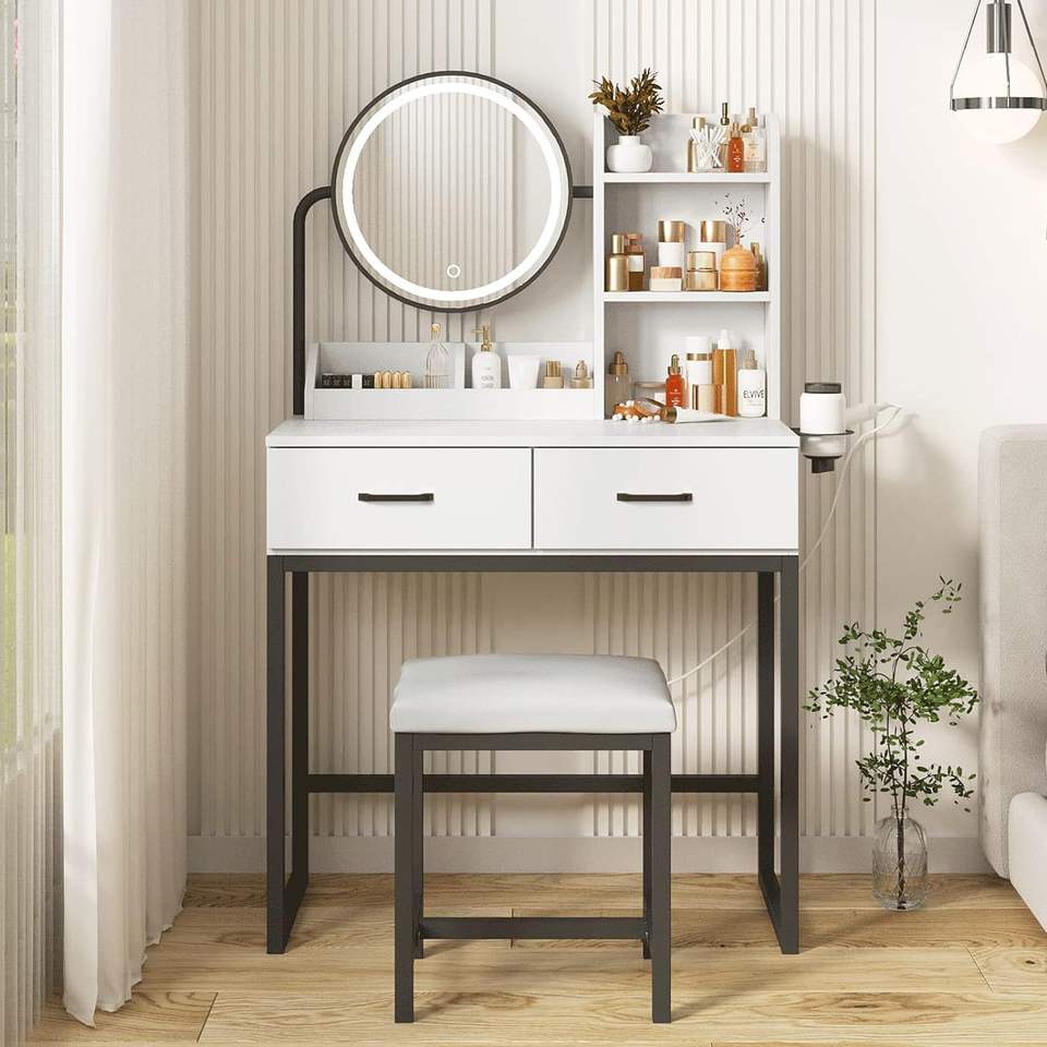 Escritorio de tocador con toma de corriente de espejo con luz LED, mesa de maquillaje con gabinete de cajones, taburete de almacenamiento, para dormitorio, blanco