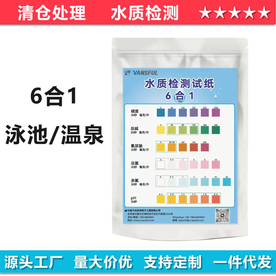 Tiras reactivas de prueba de agua Vansful 6 en 1 para piscinas, aguas termales y spas, 100 piezas, detección de pH, cloro y dureza.