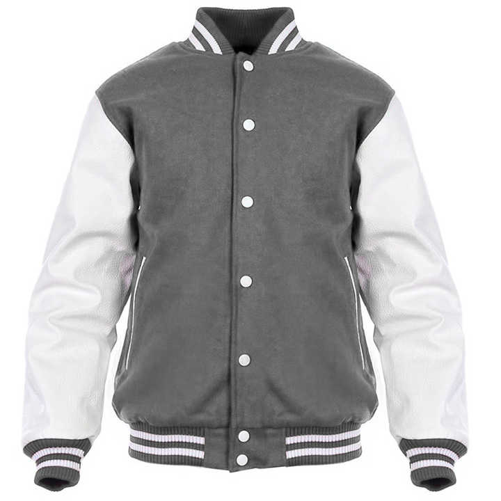 Varsity Letterman Jacket Cuerpo de lana gris Mangas de cuero blanco Classic High School CollegeBaseballjacket para hombres DDP Shipping