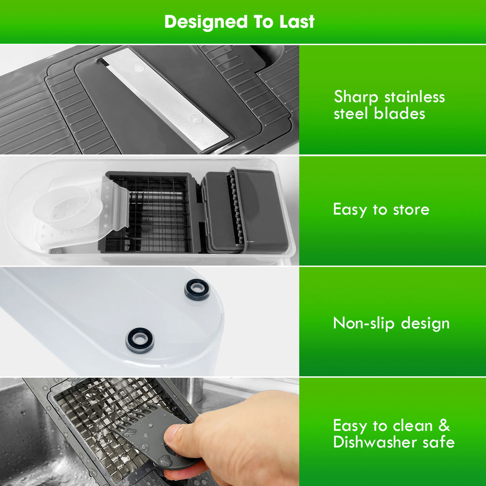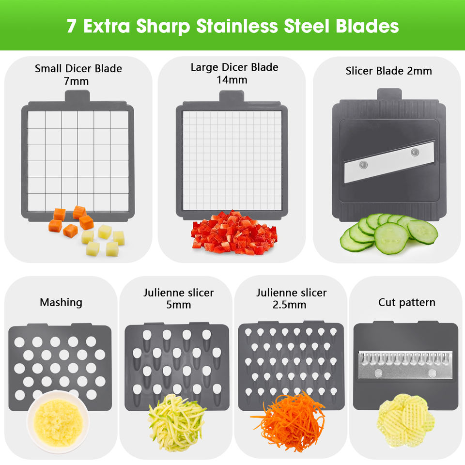 Picador de Verduras con 7 Cuchillas, Cortador de Cebolla con Recipiente, Cortador de Alimentos y Rallador, Rebanador Mandolina
