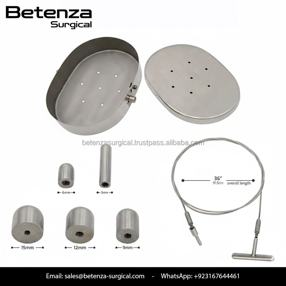 Caja de acero inoxidable ovalada con fenestraciones y mecanismo deslizante