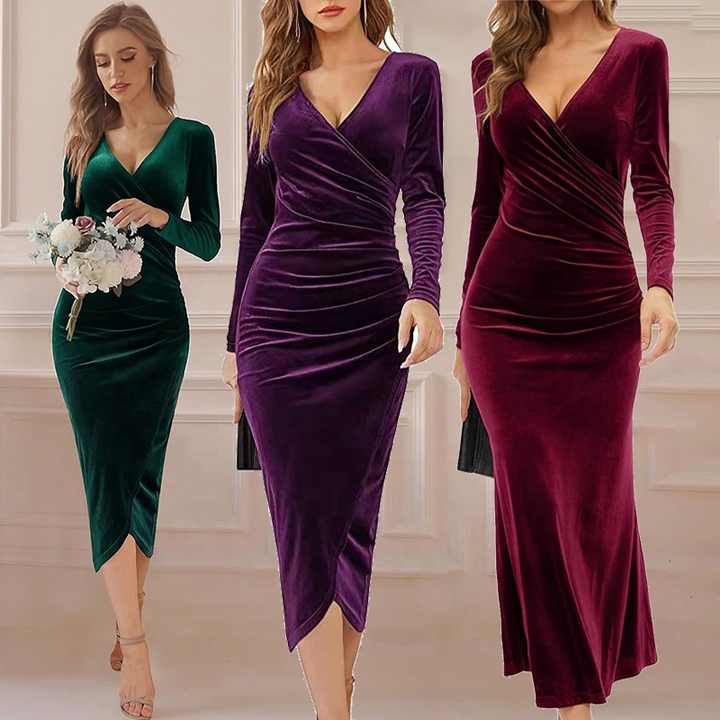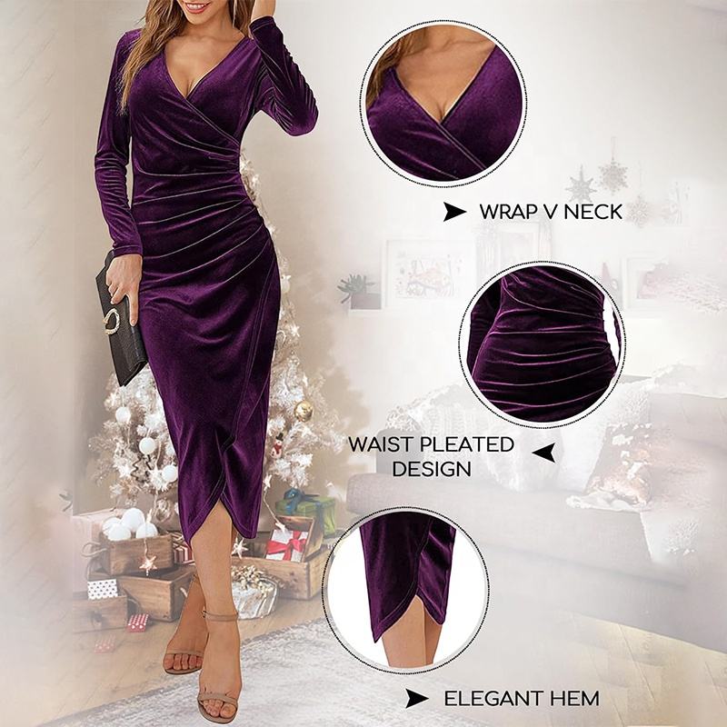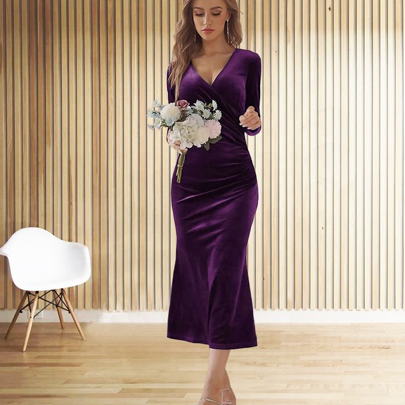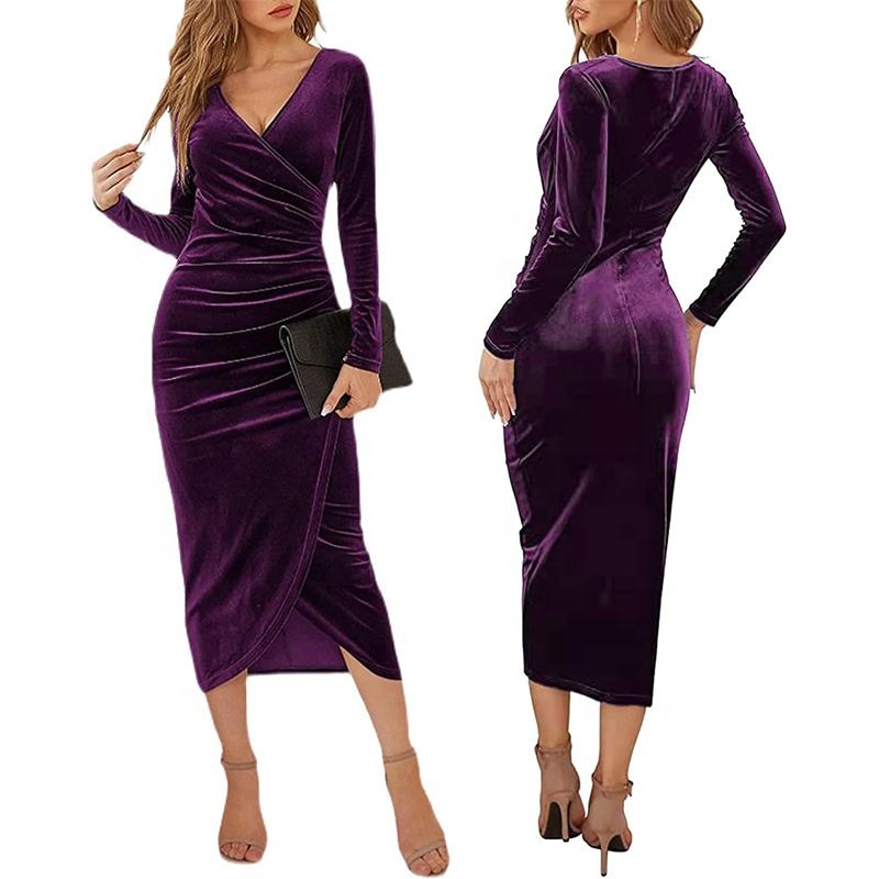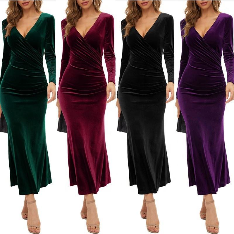 Terciopelo Vestidos casuales Fruncido Slim Fit Manga larga Señoras Vestido largo Terciopelo Elegante Vestido de noche Ropa formal Vestido de fiesta