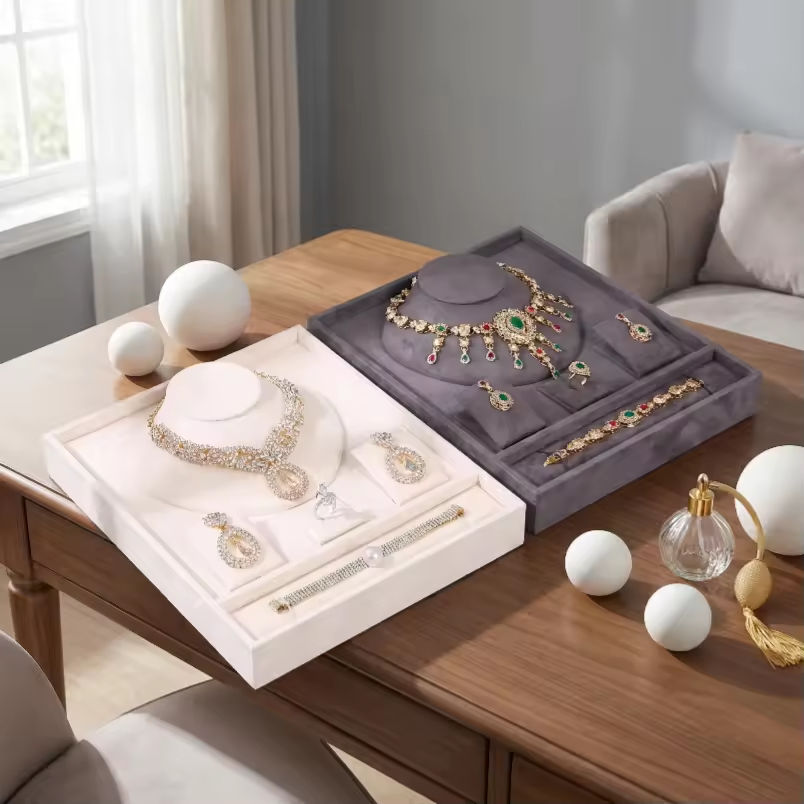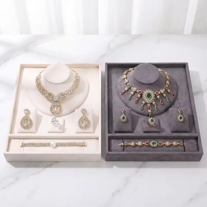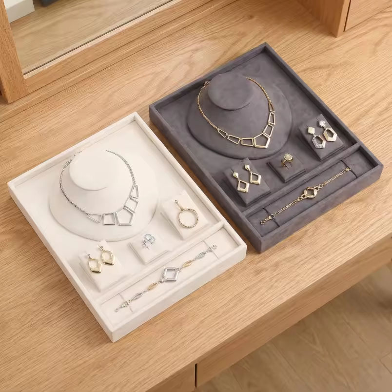 Juego de bandejas de terciopelo para joyería, expositor de tienda para anillos, pulseras, collares y pendientes, con soporte y bandeja