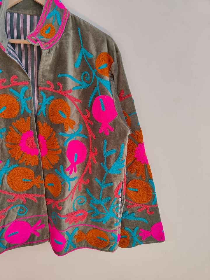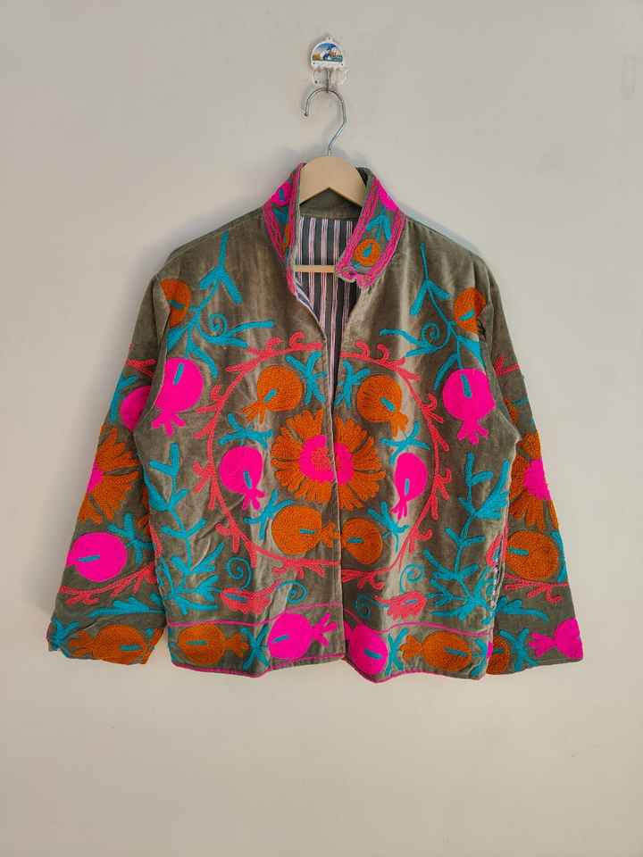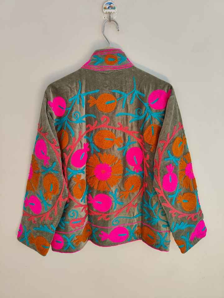 Chaqueta Suzani de Terciopelo, Abrigo Floral Bordado Estilo Boho, Chaqueta Tribal Uzbeka Hecha a Mano, Prenda Exterior Artística
