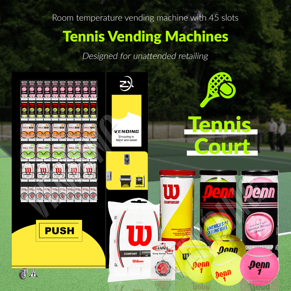 Máquina expendedora con sistema de alquiler para rentar palas de pádel, pelotas de tenis y productos deportivos y de entretenimiento