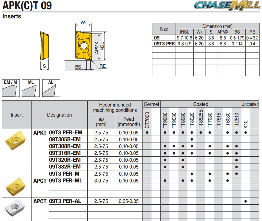 Insertos versátiles para fresado de hombros 90° TaeguTec Carbide APK(C)T Serie 09, 2 filos, geometría positiva, para acero/acero inoxidable, uso general OEM