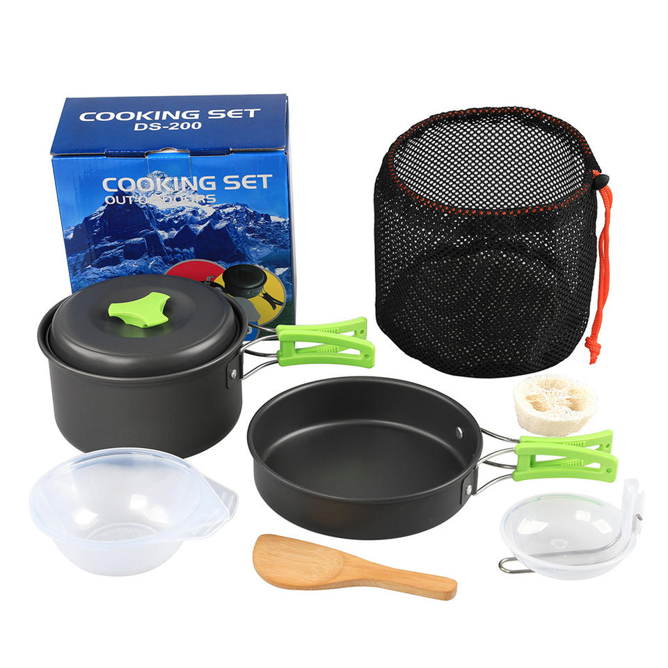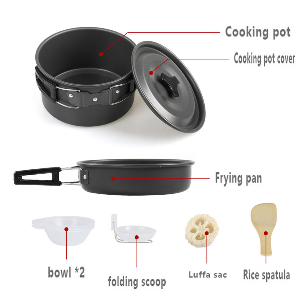 Equipo de cocina al aire libre versátil, juego de utensilios de cocina de aluminio y titanio al por mayor con marca personalizada lista para acampar