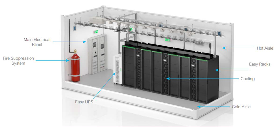 Centro de Datos Modular Vertiv EcoStruxure con IA, Contenedor ISO, 38kW, 5 Racks, UPS en Línea, Trifásico, 400V, Infraestructura Informática Prefabricada