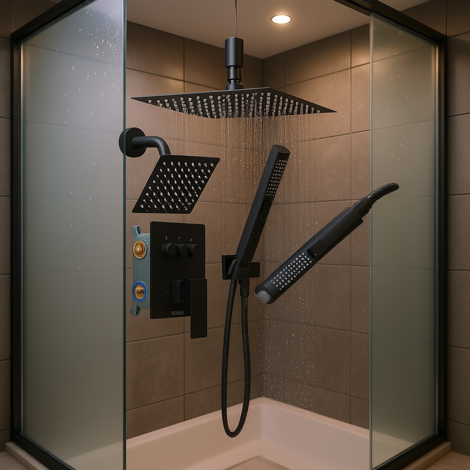Sistema de Ducha de Lluvia Vevor de 10 Pulgadas, Montaje en Pared de 6 Pulgadas, Juego de Válvulas de Latón de Doble Cabezal, Baño Contemporáneo, Negro Mate
