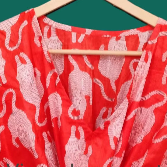 Nuevo y Elegante Kaftán Midi Rojo Vibrante, Estampado a Mano, Ecológico, de Algodón, Estilo Bohemio, para el Verano