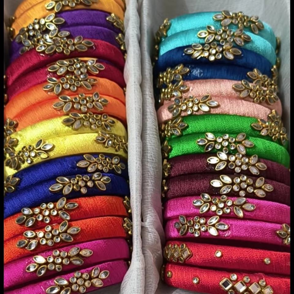 Brazaletes de hilo de seda vibrantes de primera calidad con intrincados adornos de piedras Kundan, ligeros.