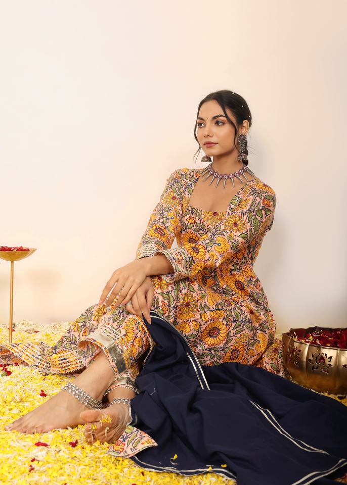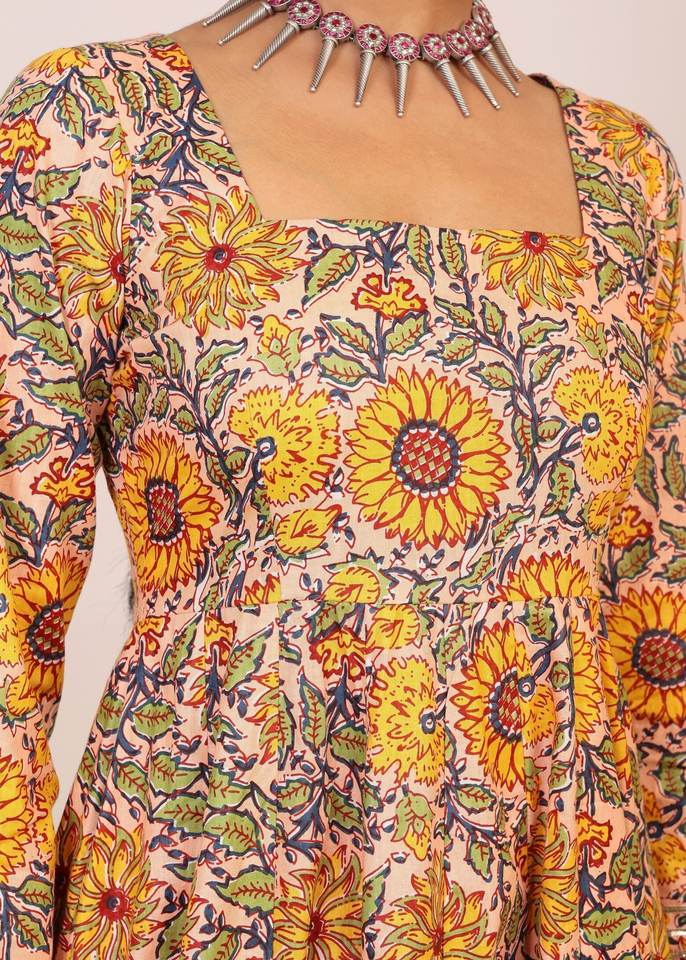 Nombre del producto:Conjunto de traje de Anarkali con estampado floral amarillo y multicolor con pantalón