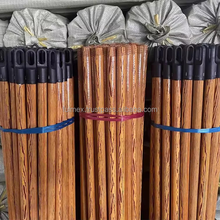 Suministro a granel de Vietnam, mango de plástico de PVC, 120cm, palo de escoba de madera de eucalipto, diseño de grano, recogedor de uso doméstico, bolsa empaquetada limpia