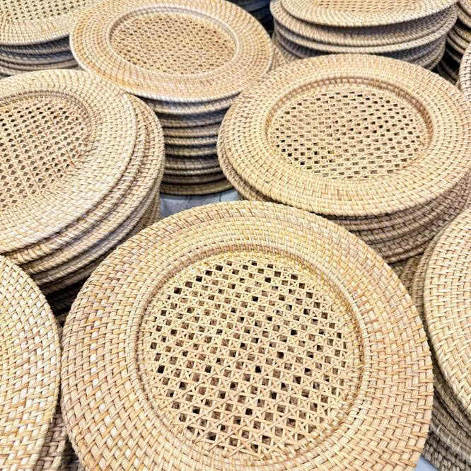 Plato de ratán rústico de 12 pulgadas hecho a mano en Vietnam, mantel individual de ratán tejido, fabricante mayorista de vajilla para exportación