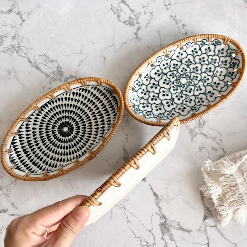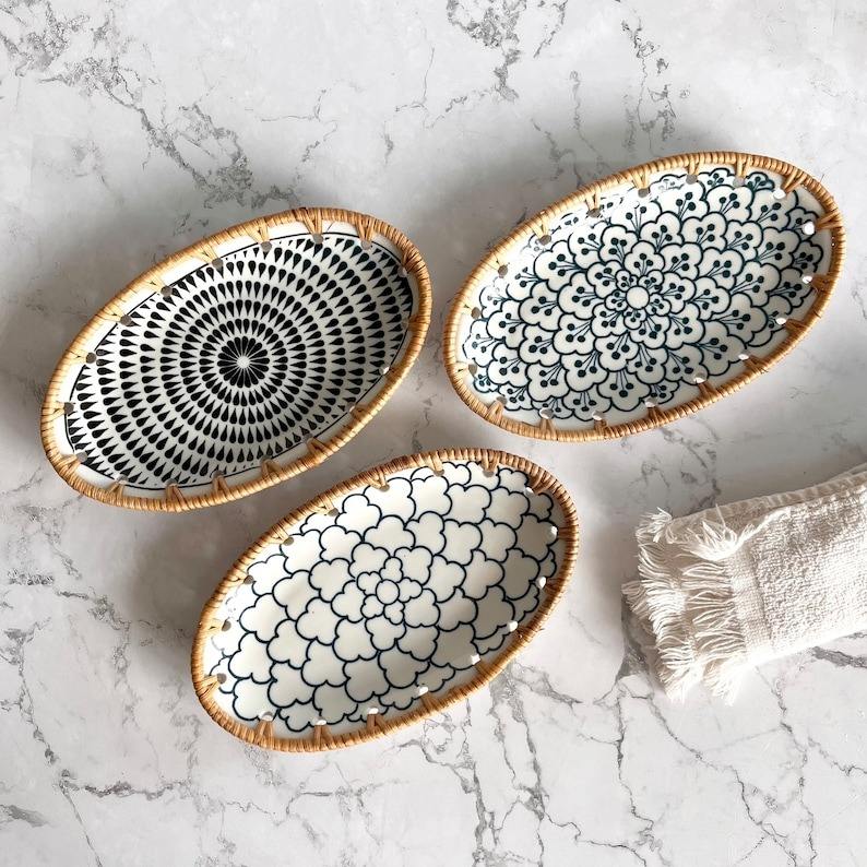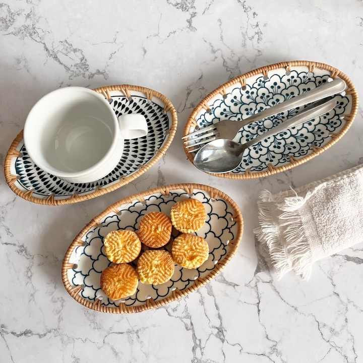 Bandeja de servicio de ratán ovalada hecha a mano de Vietnam, Plato decorativo, bandeja de cerámica de ratán, bandeja de comida de bambú para cocina, regalo de inauguración de la casa