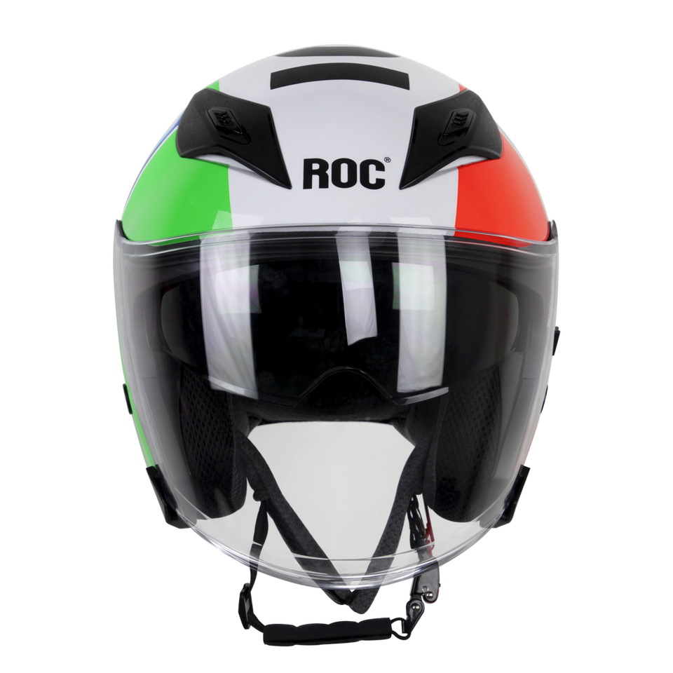 Casco abierto ROC R68 fabricado en Vietnam, ABS de alta calidad, tamaño XL, visera doble, mecanismo de liberación rápida, gráfico acolchado