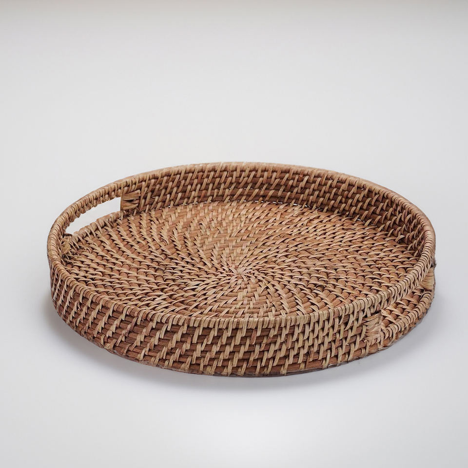 VietnamCrafts Bandeja Redonda de Bambú Ecológica con Acabado Geométrico Pulido y Detalles de Ratán Hechos a Mano para Uso en Hoteles-SR2048