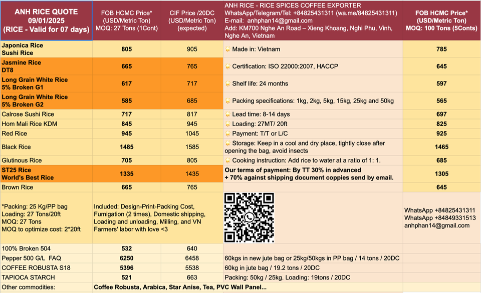 Arroz Blanco Orgánico Vietnamita de Textura Dura, Arroz Jazmín Fresco de Grano Largo 4-6mm, Cosecha 2024, 5% de Grano Partido