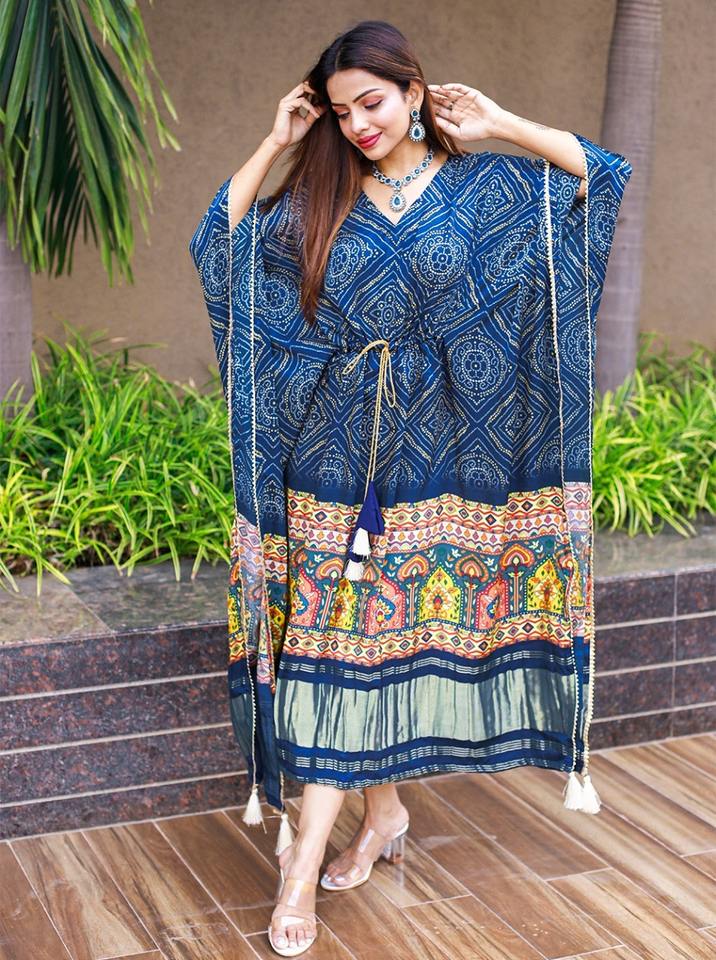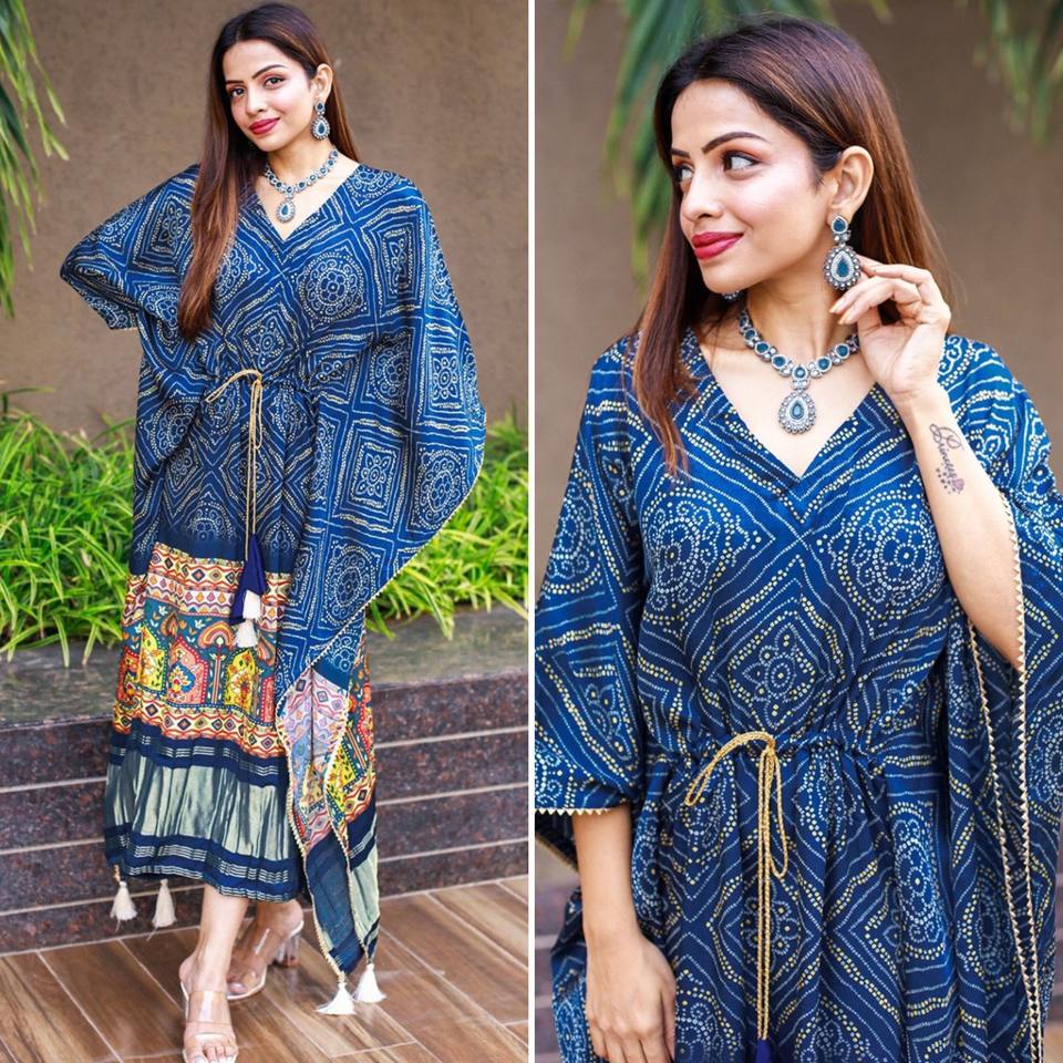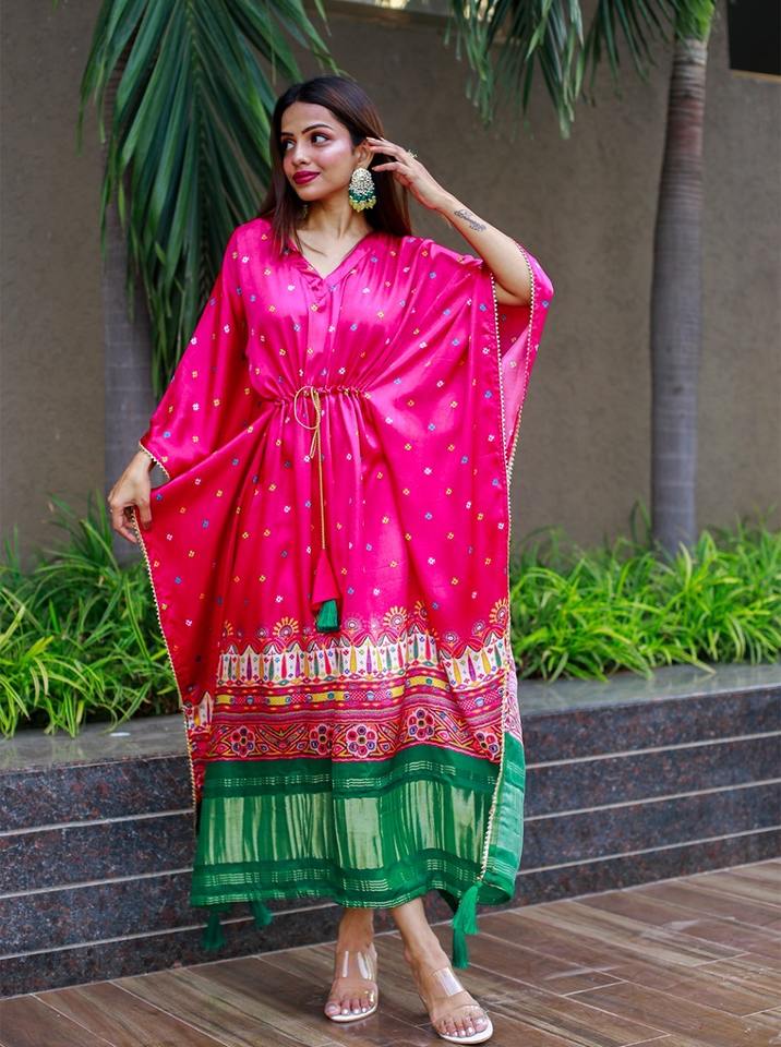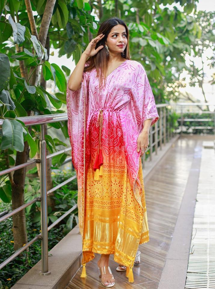 Bandhej-imágenes más grandes para compartir ropa India moderna, seda pura Gaji, impresión Digital con Gotta Patti, Borde de encaje