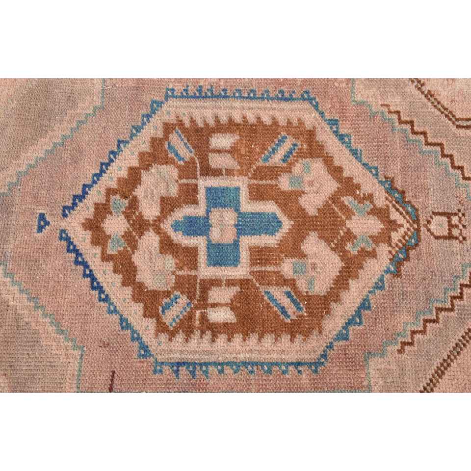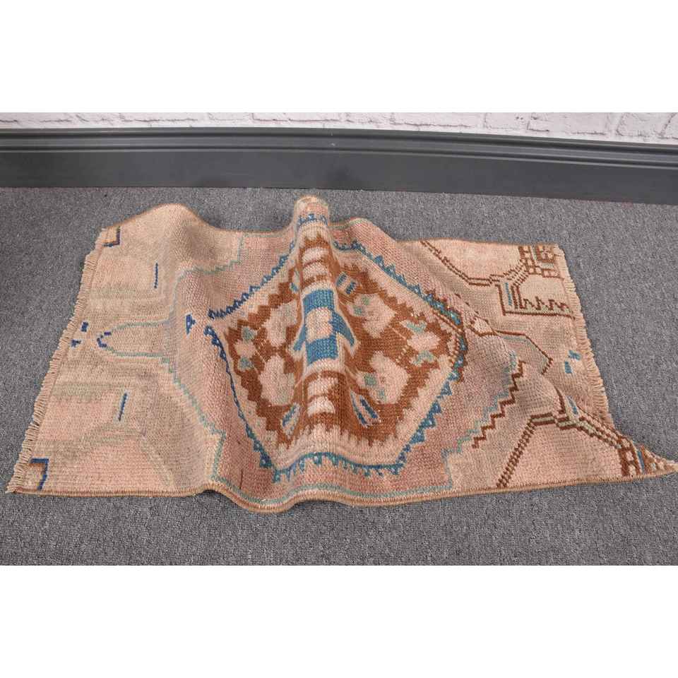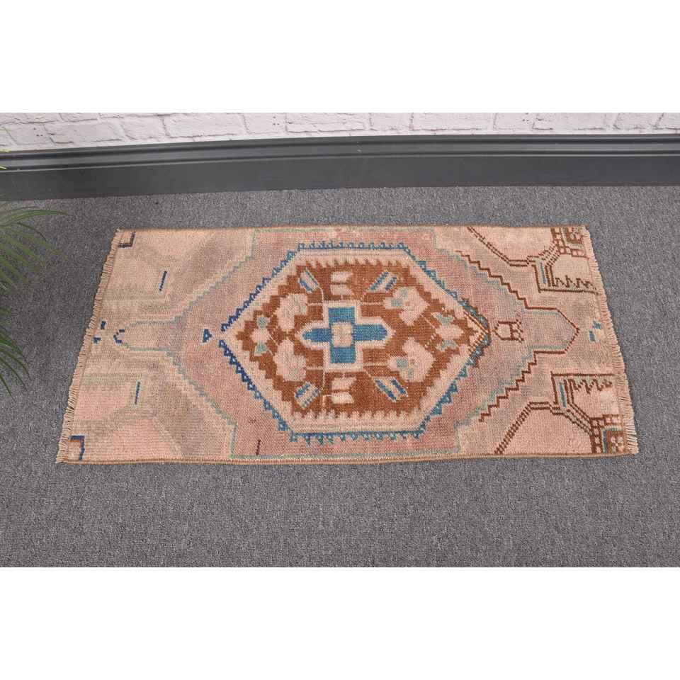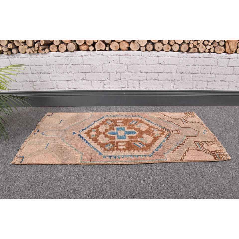 Alfombra Vintage de 1.4x2.7 pies, Alfombra Turca Pequeña, Alfombra de Lana con Estampado Animal en Tonos Marrón y Azul