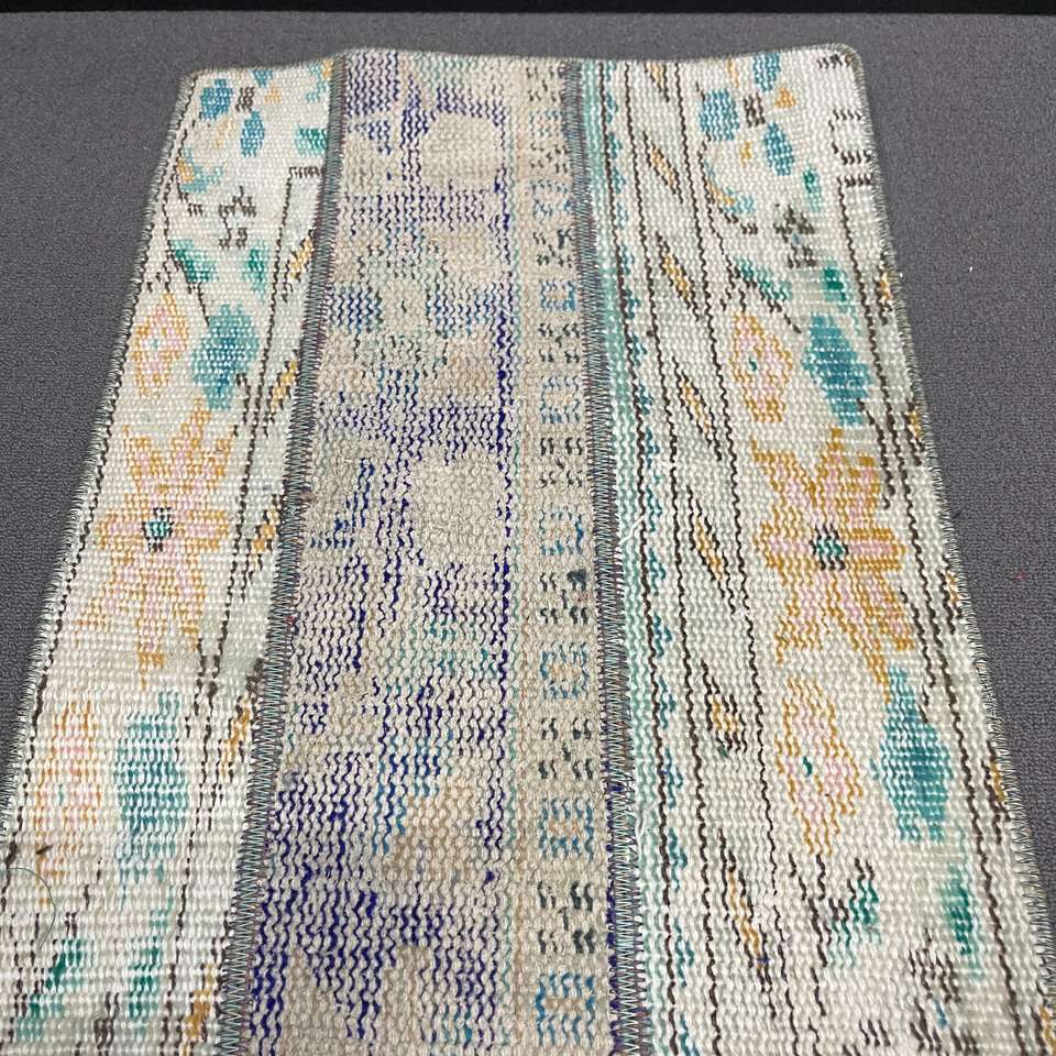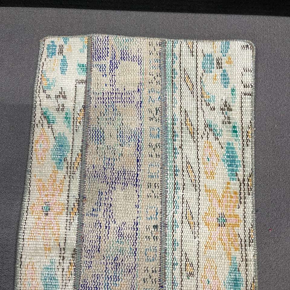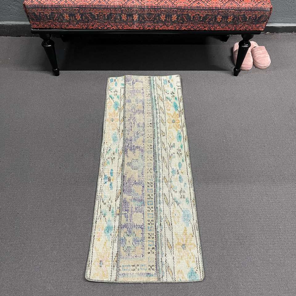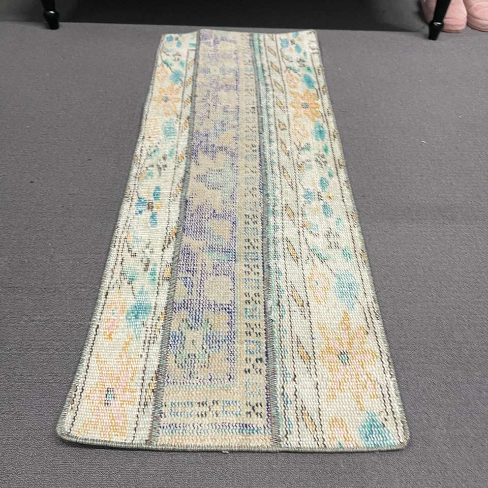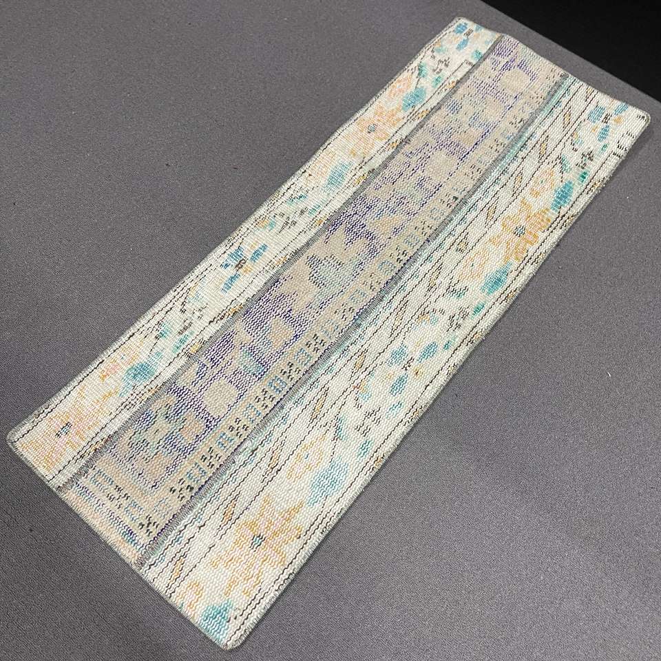 Alfombra Vintage de 1.4x3.8 pies, Alfombra Turca Pequeña, Alfombra Azul y Blanca Sólida