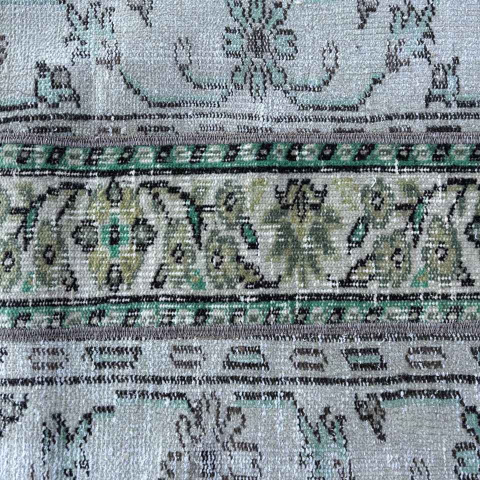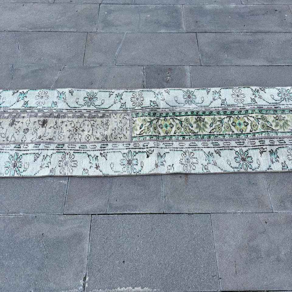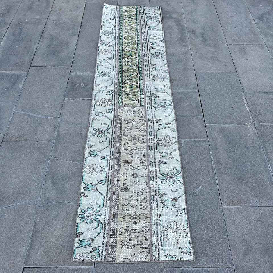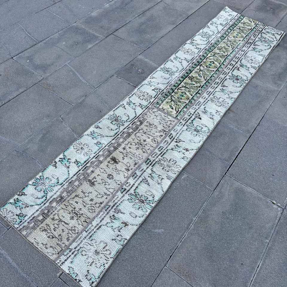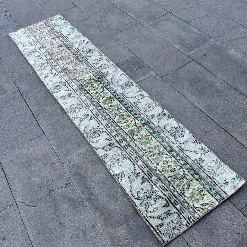Alfombra Vintage de 1.7x7.4 pies, Alfombra Turca, Alfombra Floral Azul Verde