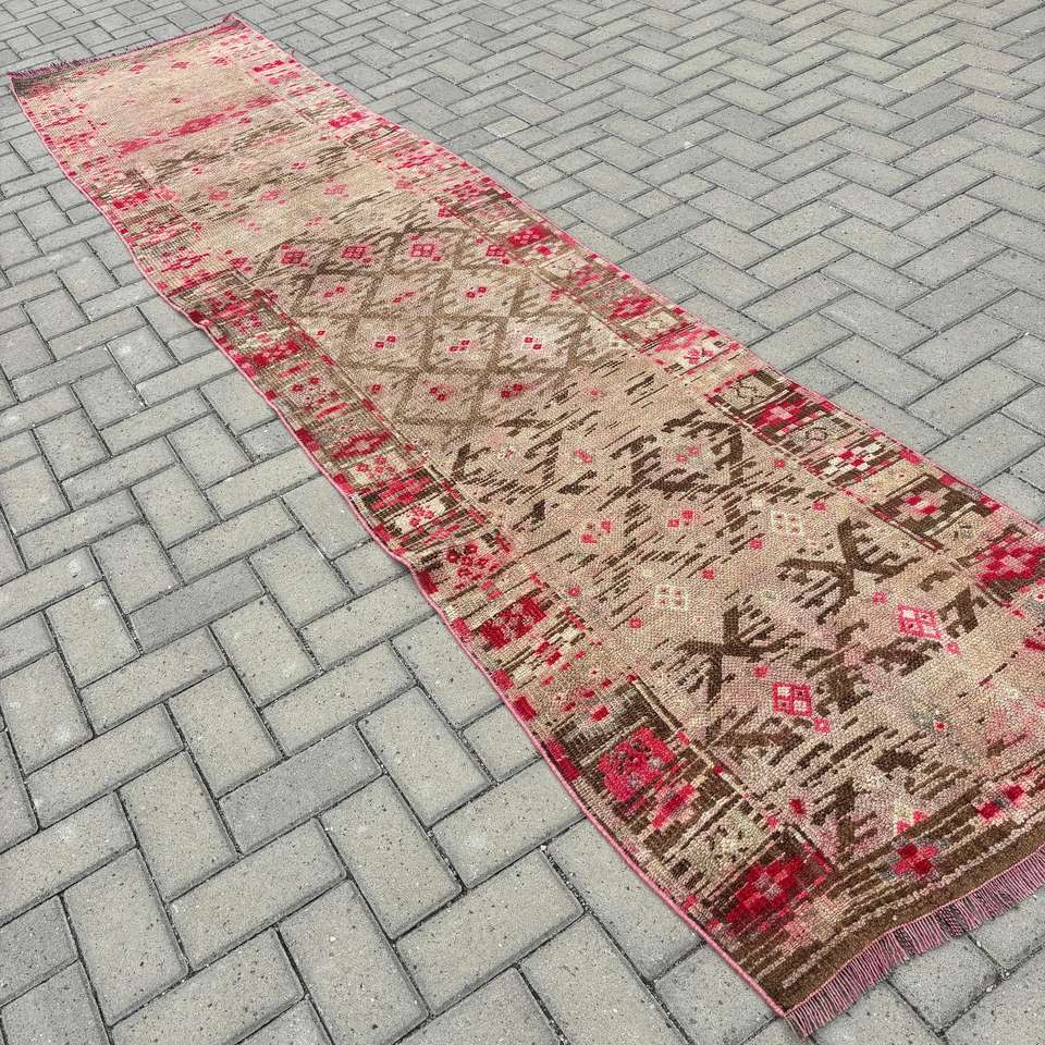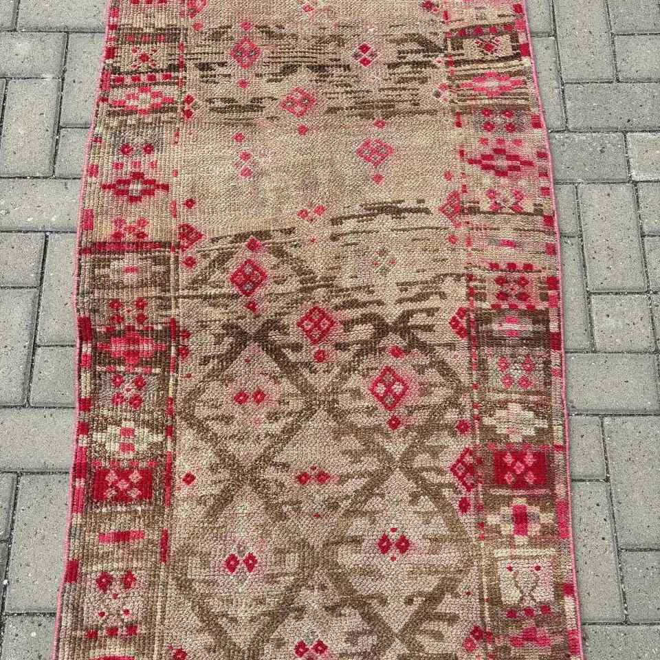 Alfombra vintage de 2.6x11.8 pies, alfombra turca, alfombra de lana con motivos de plantas y árboles rojos
