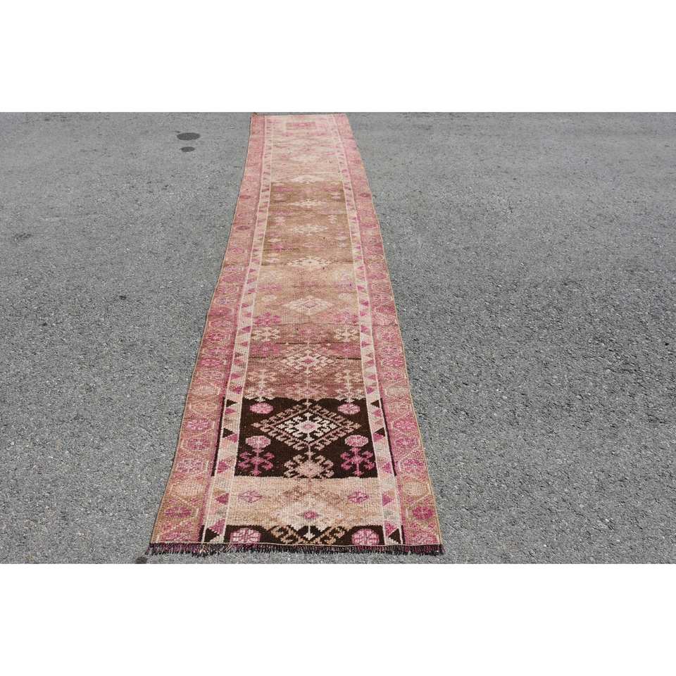 Alfombra turca Vintage de 26 'X 13', Alfombra de lana de tejido plano rosa y marrón con respaldo de látex para decoración de sala de estar o uso en coche