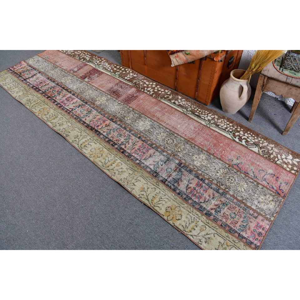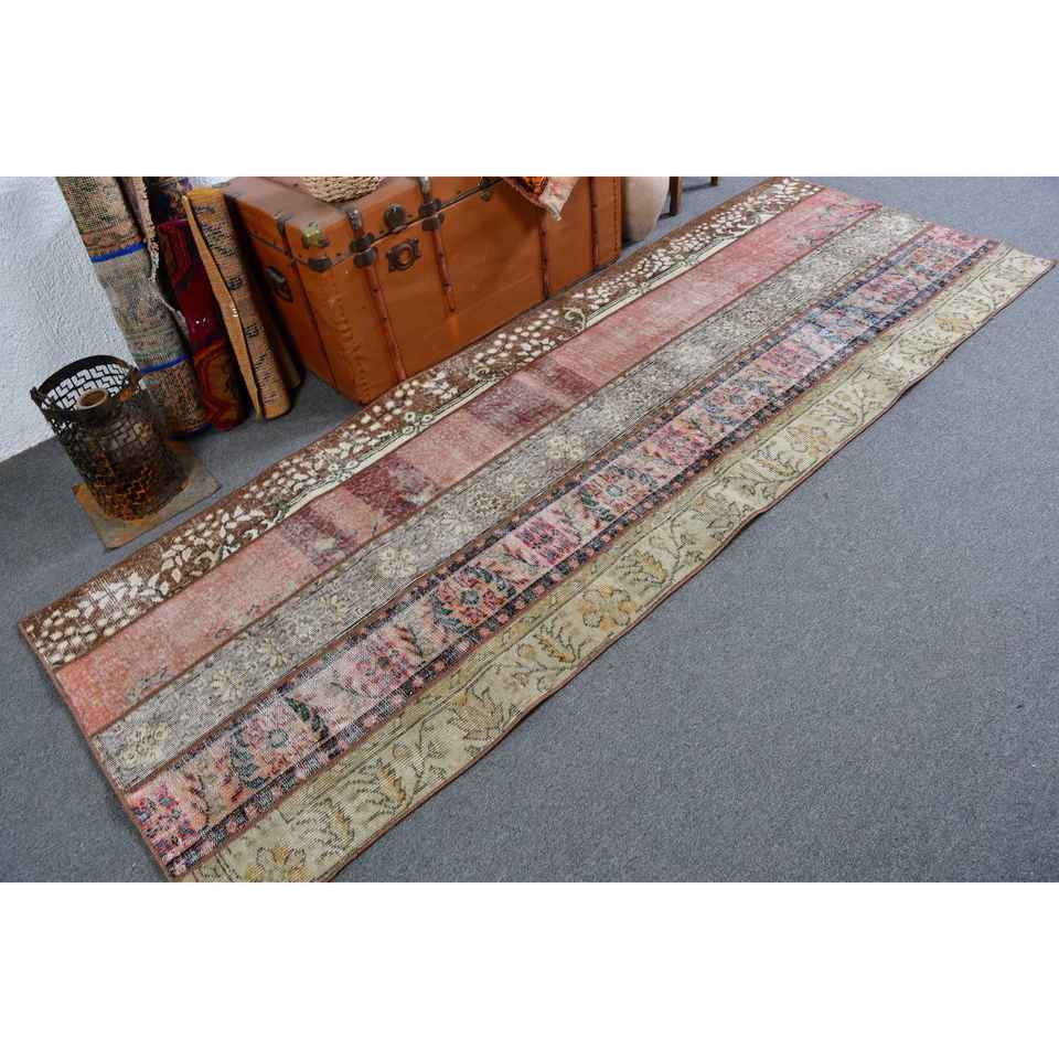 Alfombra Turca Vintage de 3.1x8.9 pies, Estilo Corredor, Marrón Rojizo, con Parches de Lana y Respaldo de Látex, Ecológica