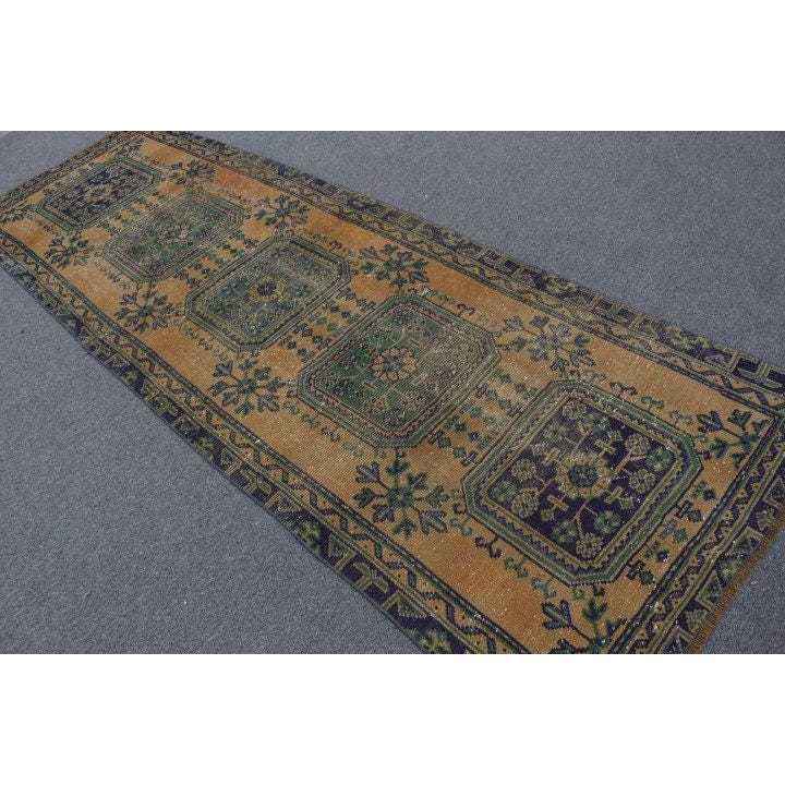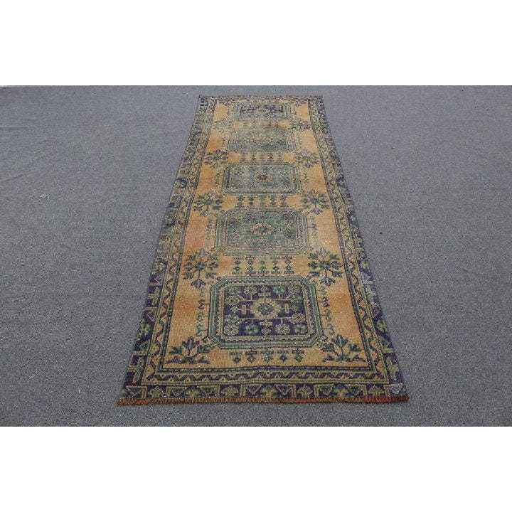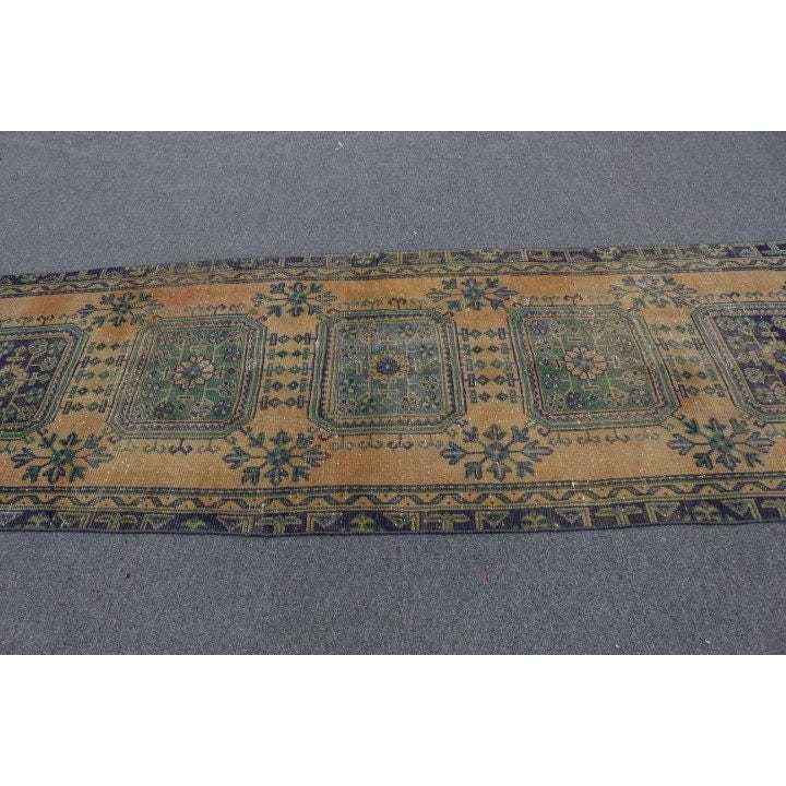 Alfombra Vintage de 3.3x9.7 pies, Alfombra Turca, Alfombra Azul de Lana Marroquí