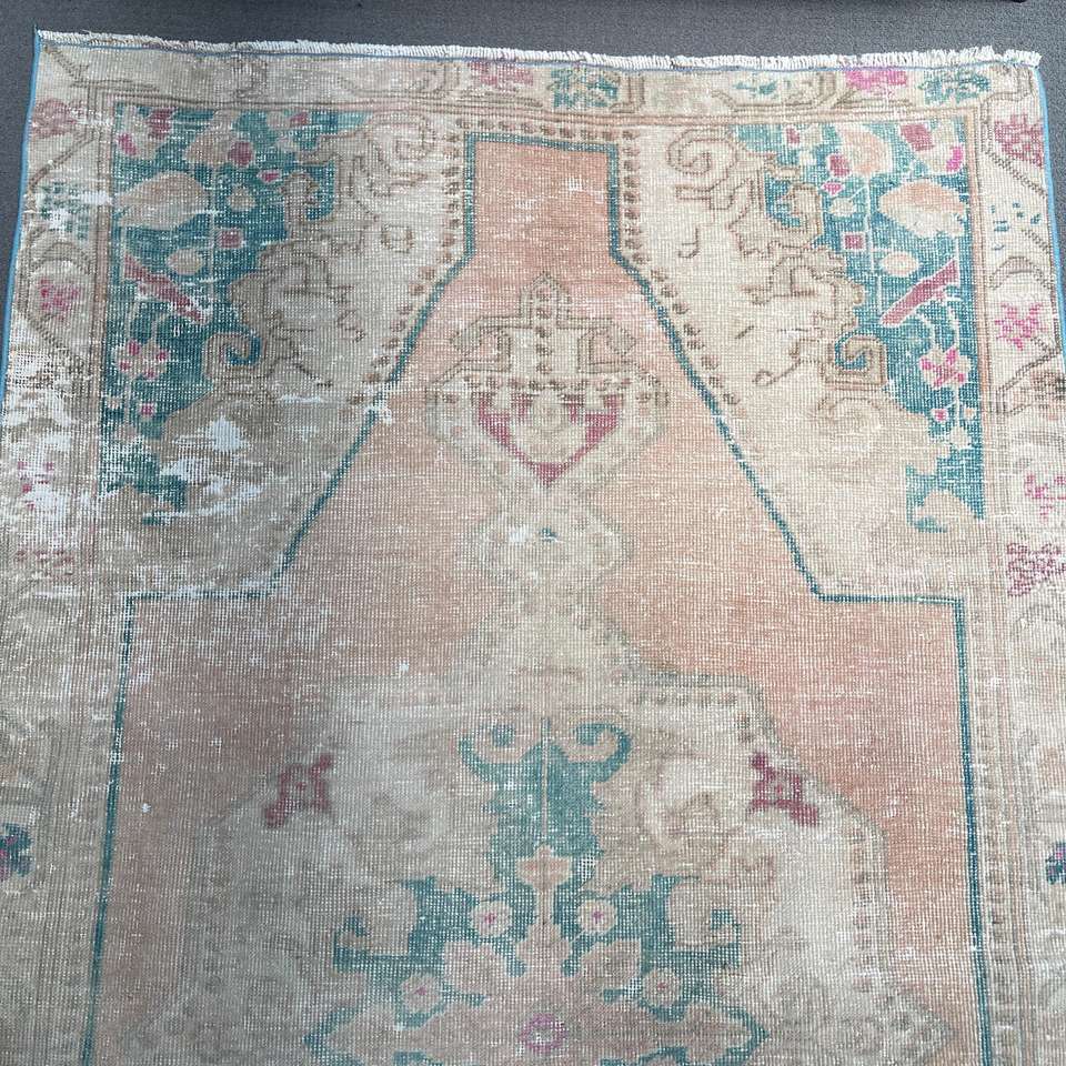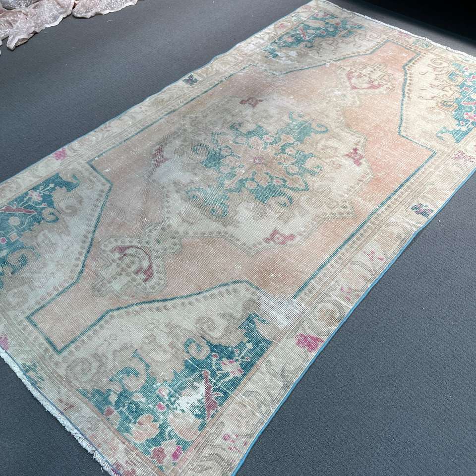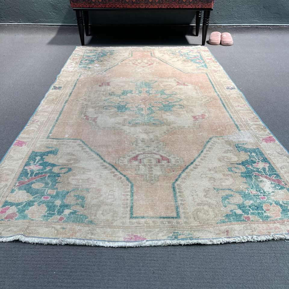 Alfombra Vintage de 4.2x6.9 pies, Alfombra Turca, Alfombra Marroquí de Lana Azul y Rosa