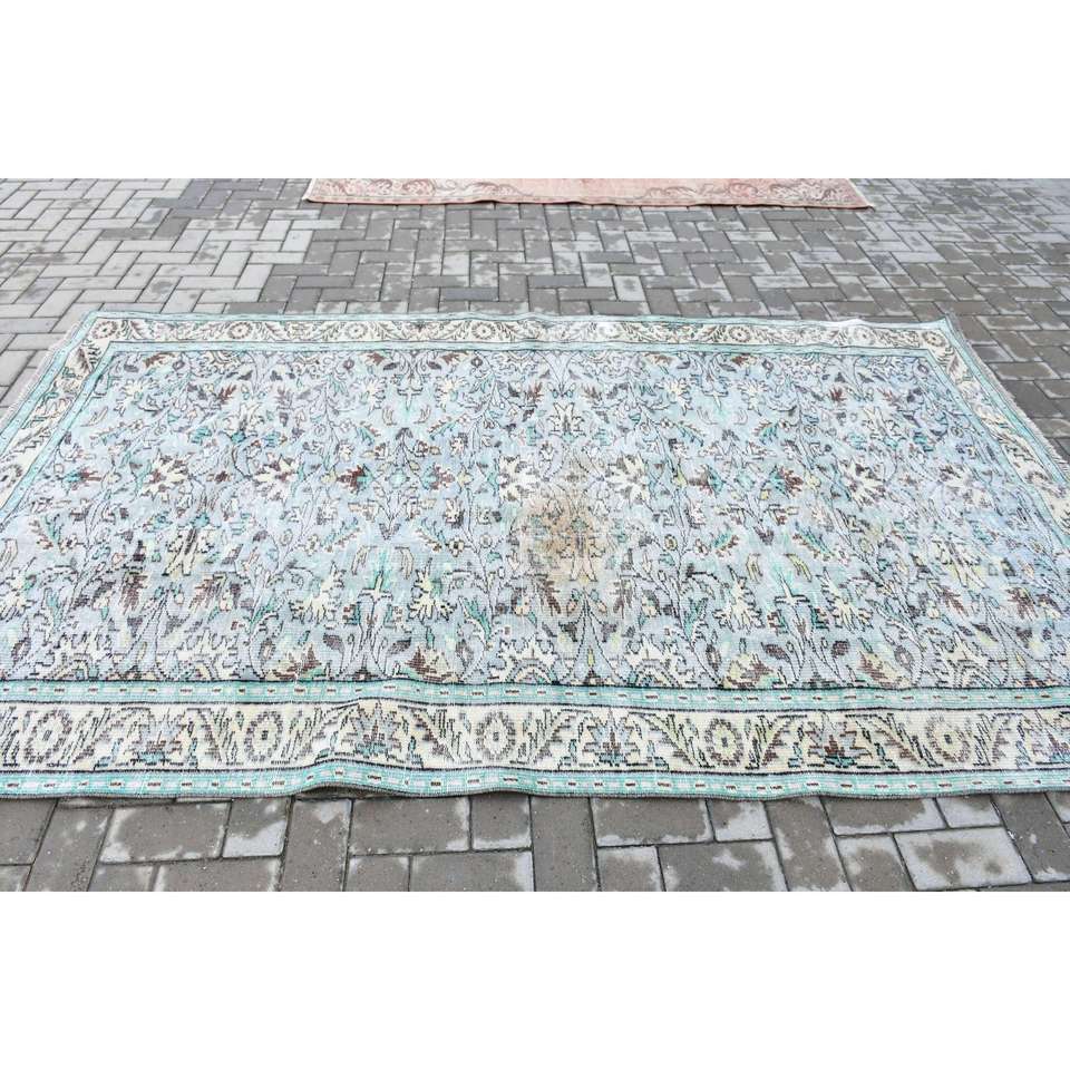 Alfombra Vintage de 5.7x9 pies, Alfombra Turca Grande, Alfombra de Lana con Diseño Floral Azul y Blanco