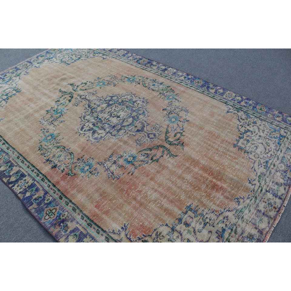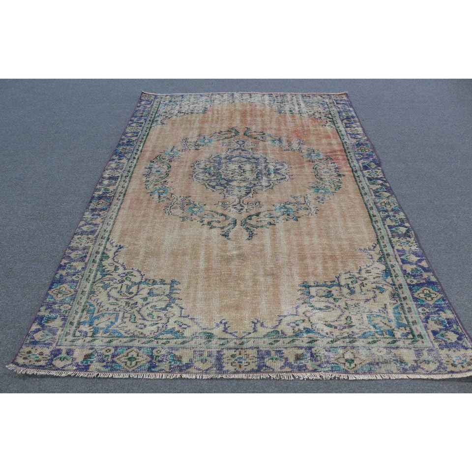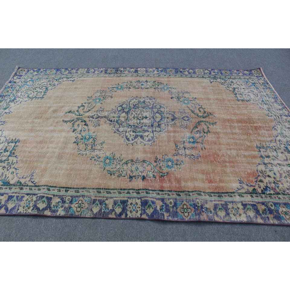 Alfombra Vintage de 5.8x8.8 pies, Alfombra Turca Grande, Alfombra de Lana con Rayas Azules
