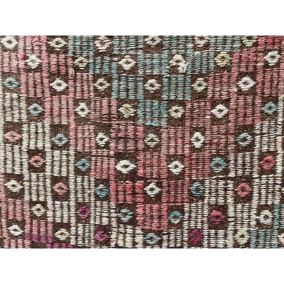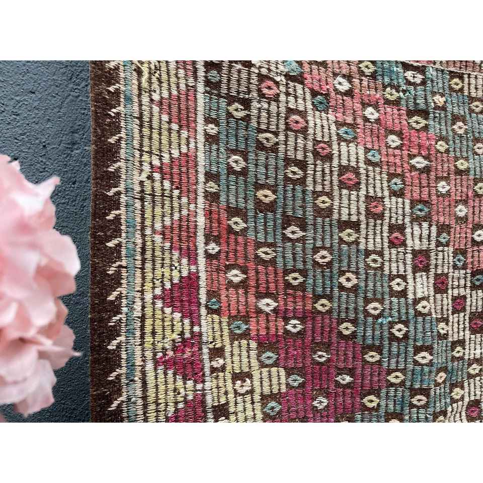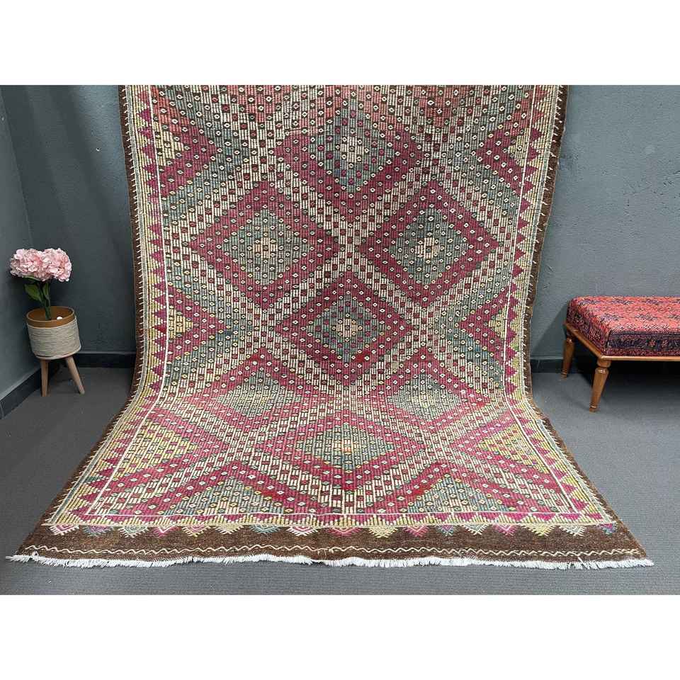 Alfombra Kilim Turca Vintage de 6.7x9.8 pies, Diseño de Parches en Degradado Rojo, Lana Ecológica con Respaldo de Látex