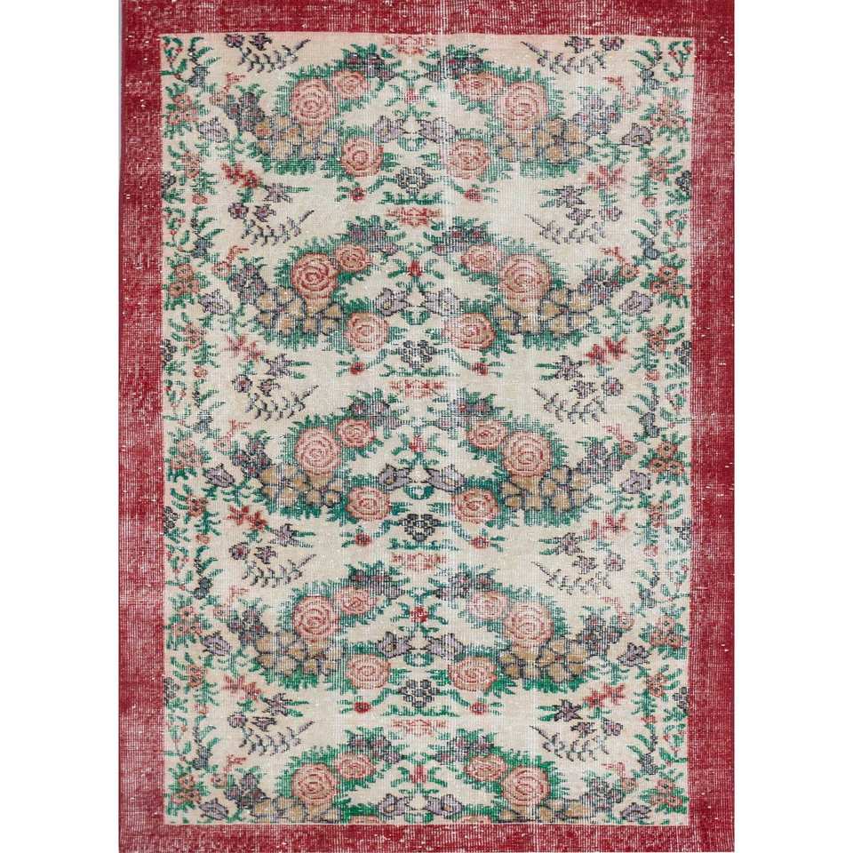 Alfombra Vintage de Lana 9x12 Roja y Naranja, Anudada a Mano, con Diseño Floral y Patrones de Rompecabezas Rectangulares para Entrada y Uso Doméstico - Pae-2272