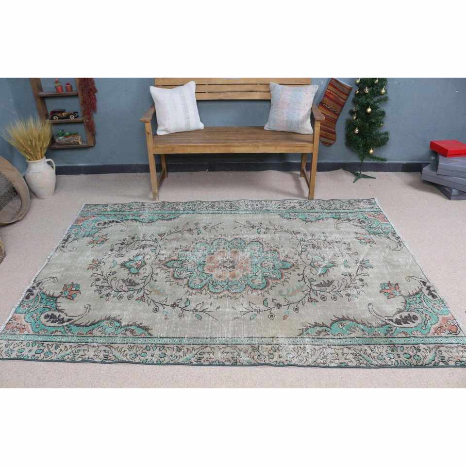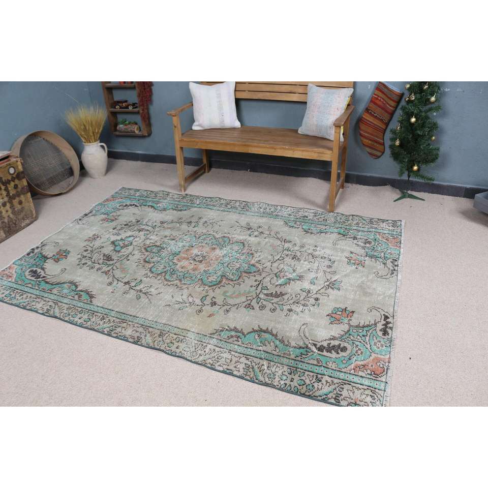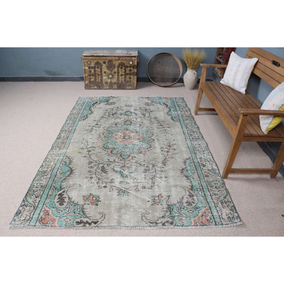 Alfombra Vintage de Lana con Diseño a Cuadros Azul Turco, 5x7.3 pies