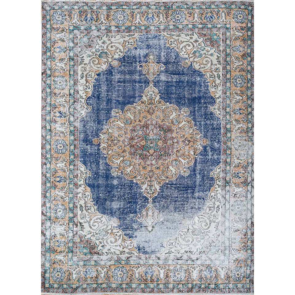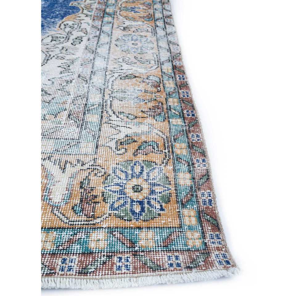 Alfombra de Lana Azul Vintage Anudada a Mano Pae-2602 para Entrada, Sala de Estar, Pasillo - Medallón Abstracto Rectangular Tipo Rompecabezas para Adolescentes