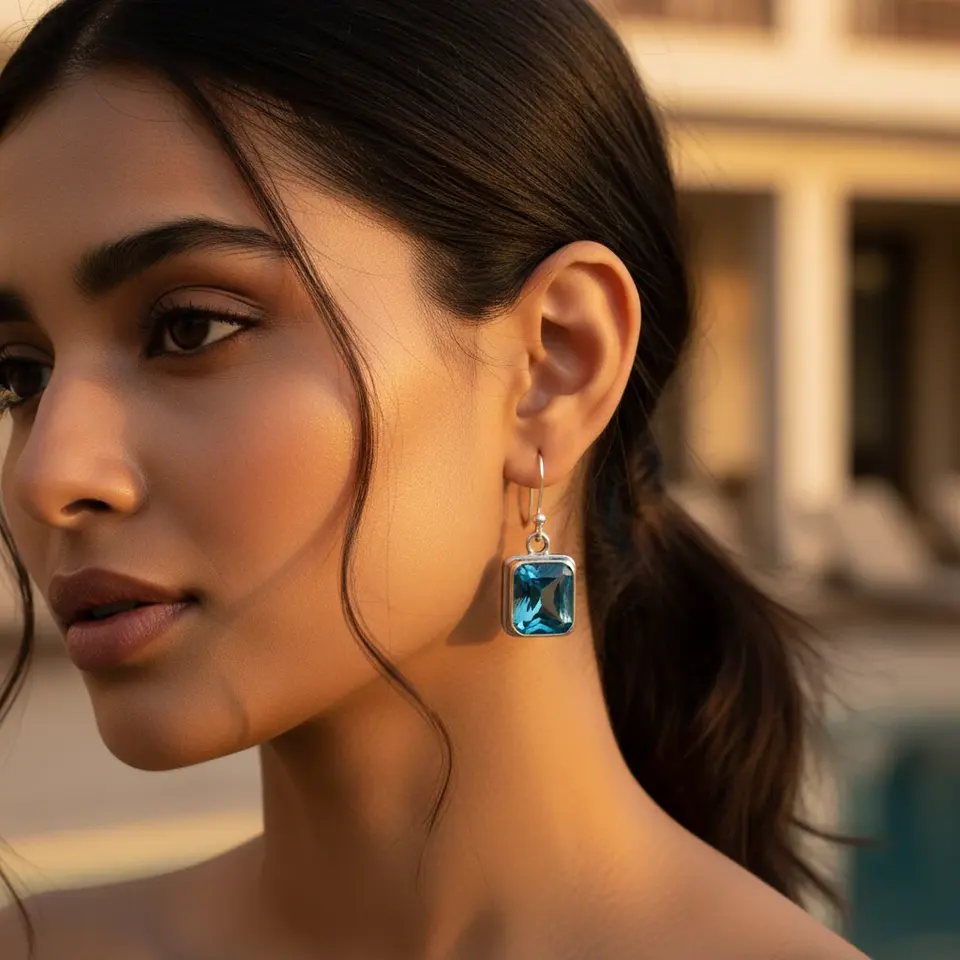 Pendientes de Aro con Topacio Azul Vintage para Mujer, Plata 925 Chapada en Oro, Diseño de Flor Moderno