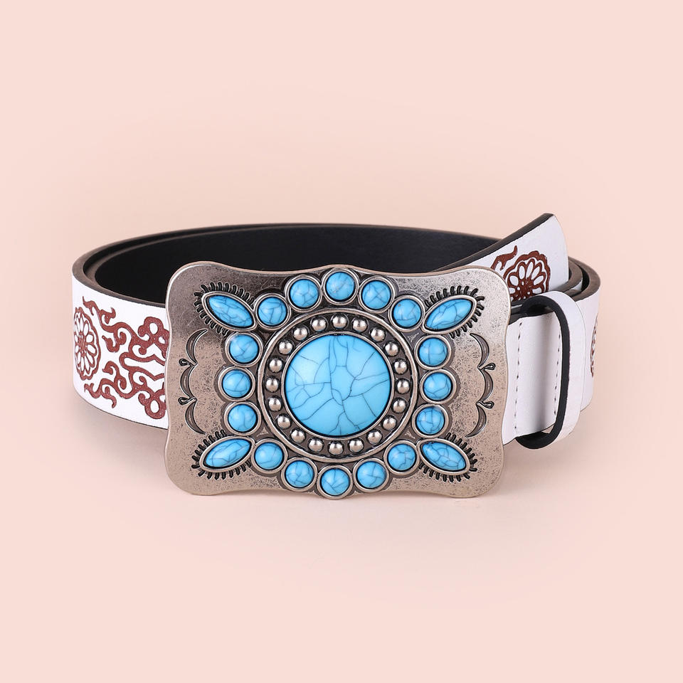 Cinturón Ancho de Cuero Genuino para Mujer, Hebilla de Aleación Tallada Simple, Longitud Personalizada, Vintage, Azul, Turquesa, Diseñador Étnico, Occidental