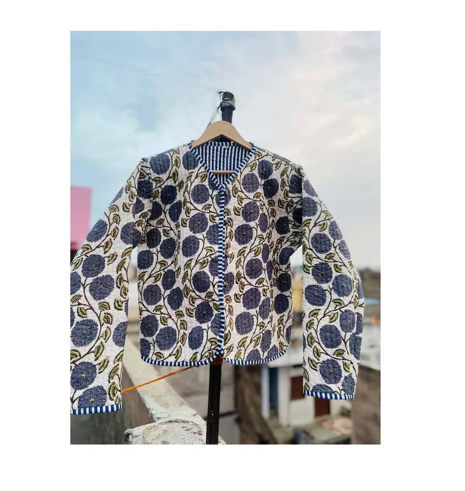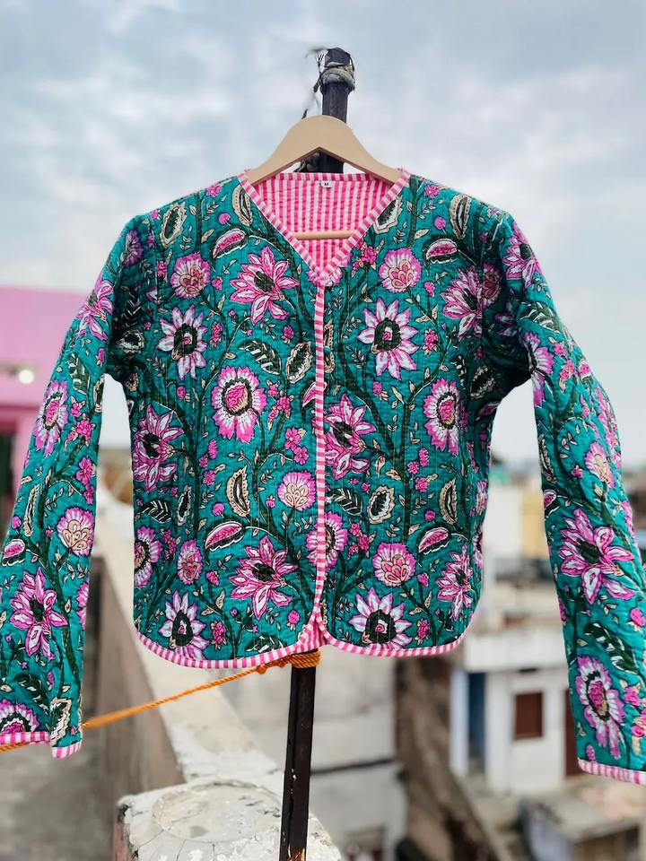 Chaqueta Acolchada de Estilo Bohemio Vintage para Mujer, Tela de Algodón con Estampado de Bloque Indio, Decoración Floral Transpirable, Corta