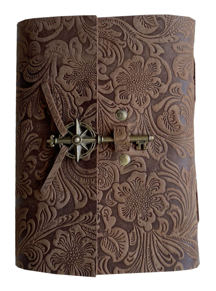 Diario con cerradura de llave marrón Vintage, diario encuadernado de cuero genuino, diario antiguo con flores de jardín en relieve, libro de hechizos, diario de sombras