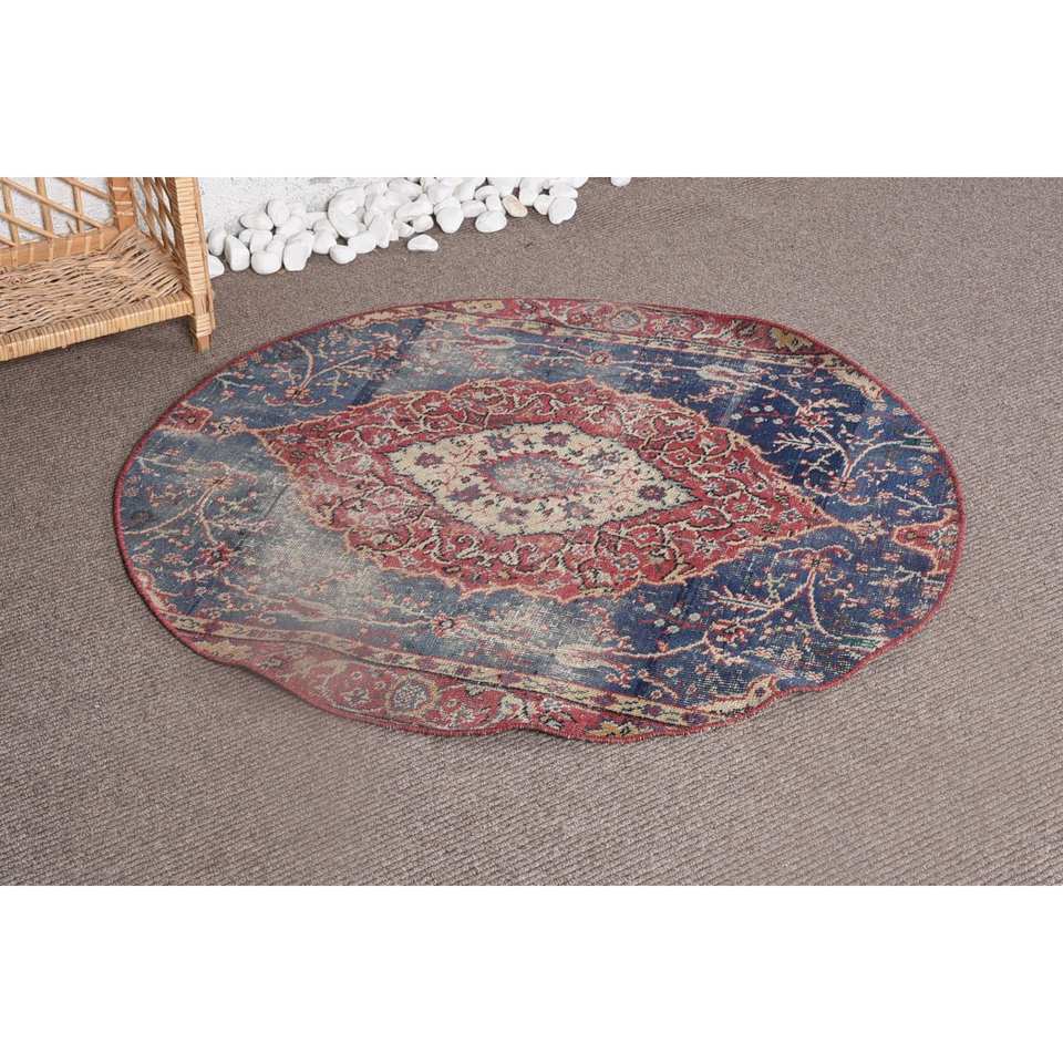 Alfombra de lana clásica vintage, diseño de retazos rojo y azul, área grande de 3,6x3,4 pies para pasillo o dormitorio con respaldo de látex