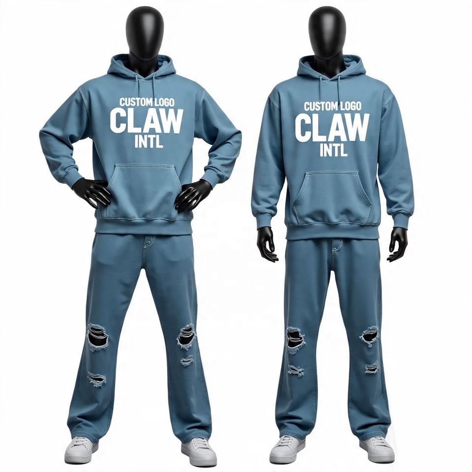 Vintage Corpped Boxy pantalones de pierna de forma curva desgastados Sun Faded Wash 2 piezas pantalones de chándal holgados y conjunto de Sudadera con capucha chándales para hombres