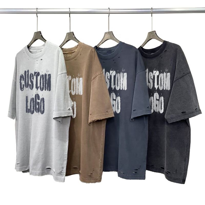 Ropa de calle gráfica con estampado personalizado Vintage algodón pesado 300 Gsm lavado con ácido de gran tamaño para hombres camiseta desgastada con hombros caídos