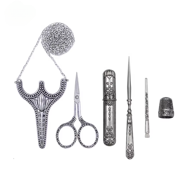 Tijeras de bordado vintage con cadena de vaina, tubo de aguja, dedal, juego de tijeras retro de punzón